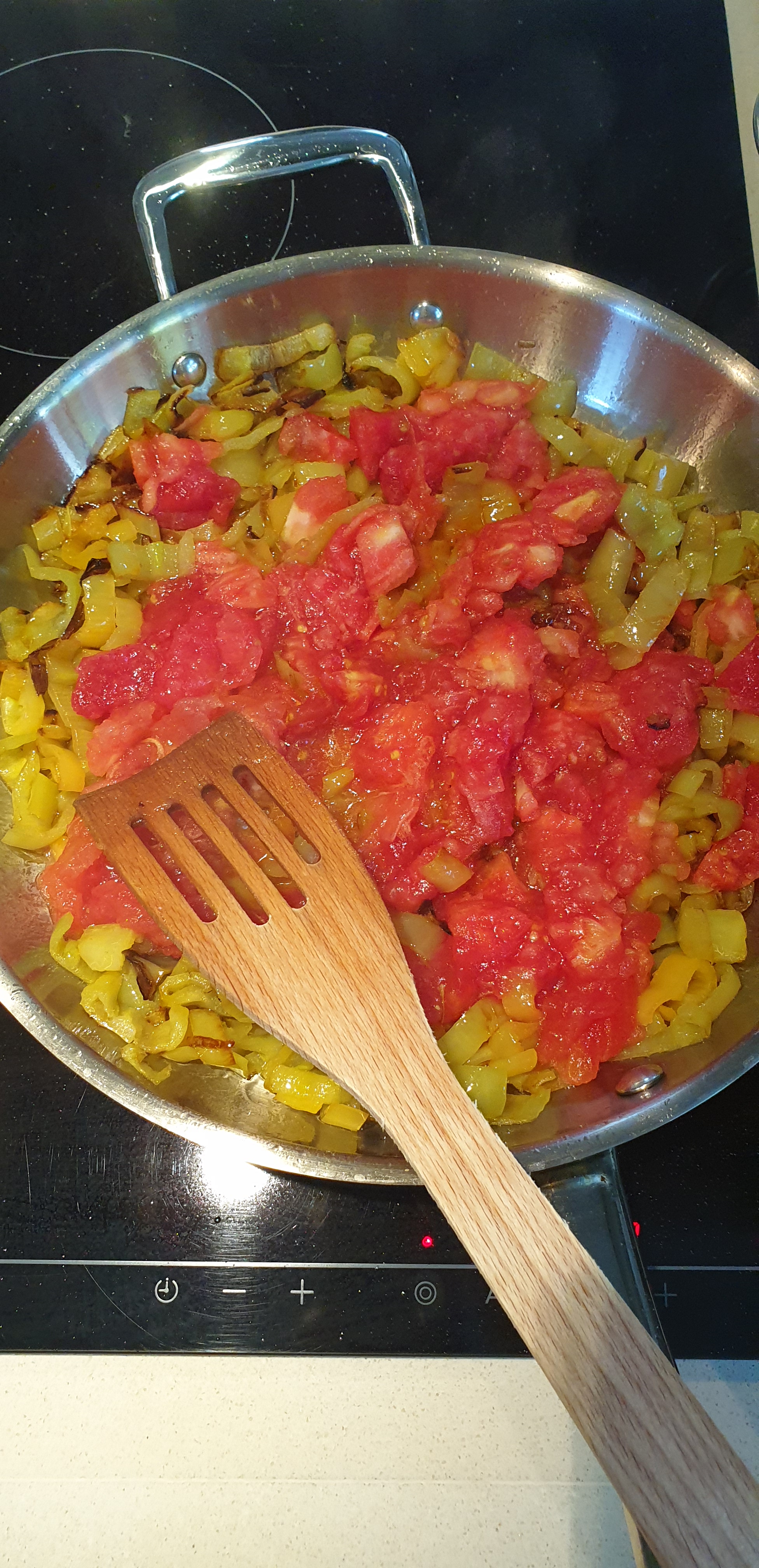 - Kur të skuqen specat, i hudhni domatet dhe vazhdoni ti përzhitni deri sa të fillon shterja e lëngut të domateve, duke e përzier herë pas here që të mos digjet fundi duke e rregulluar temperaturën sipas nevojës