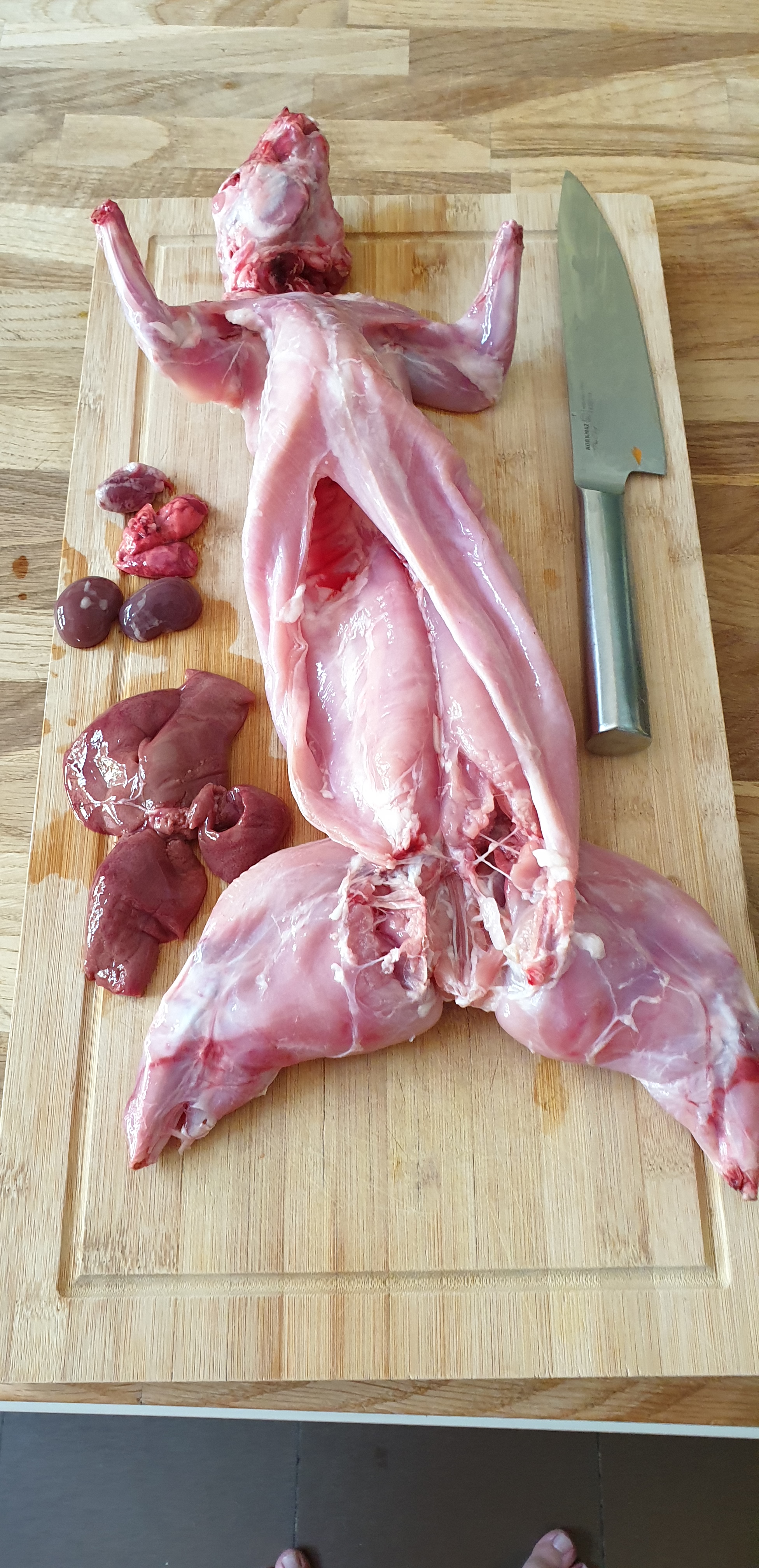 Lëngun e supës mund ta bëni nga koka dhe qafa dhe ndonjë pjesë tjetër që nuk ka mjaft mish, si pjesa e bishtit. Ose mund ti shtoni edhe këmbët e përparme. Në fotot më poshtë e shifni si duket lepuri dhe pastaj se si është i prerë. E ka principin e ndarjes pothuaj gati njejtë si pula.