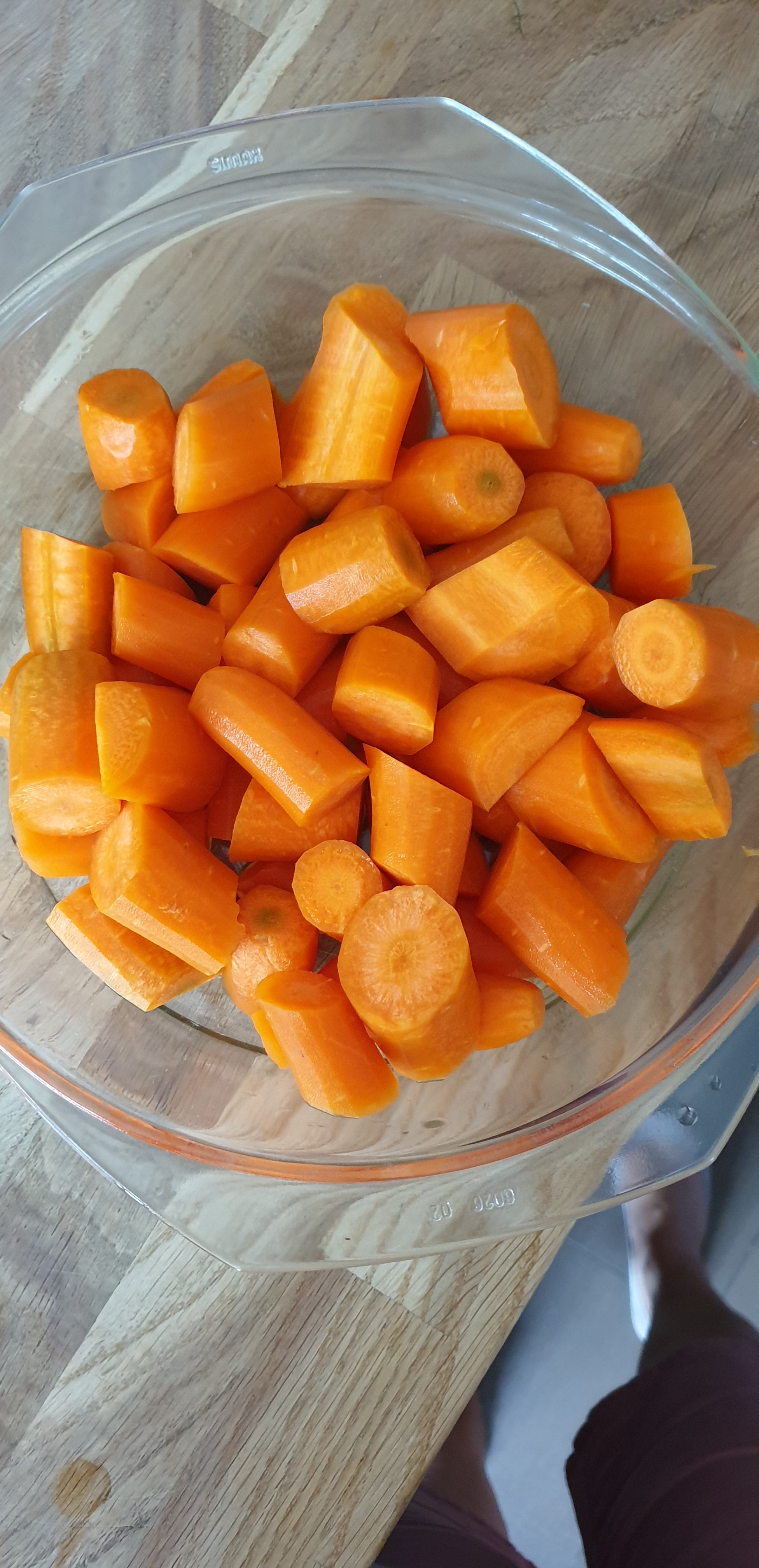 - Pastroni dhe qëroni karrotat, pastaj i coptoni në copa afro 3cm. E nxeni furrën në 200°C, i qitni karrotat në një enë me kapak dhe i pjekni 30-45 minuta, ose deri sa të ju duket se janë zbutur mirë. Mund edhe ti zieni por me pjekje i ruani vlerat ushqyese më shumë dhe kur i zieni duheni pastaj ti avulloni ujin, që mua më duket e panevojshme pasi që shija dhe vlerat e karrotës do të humben