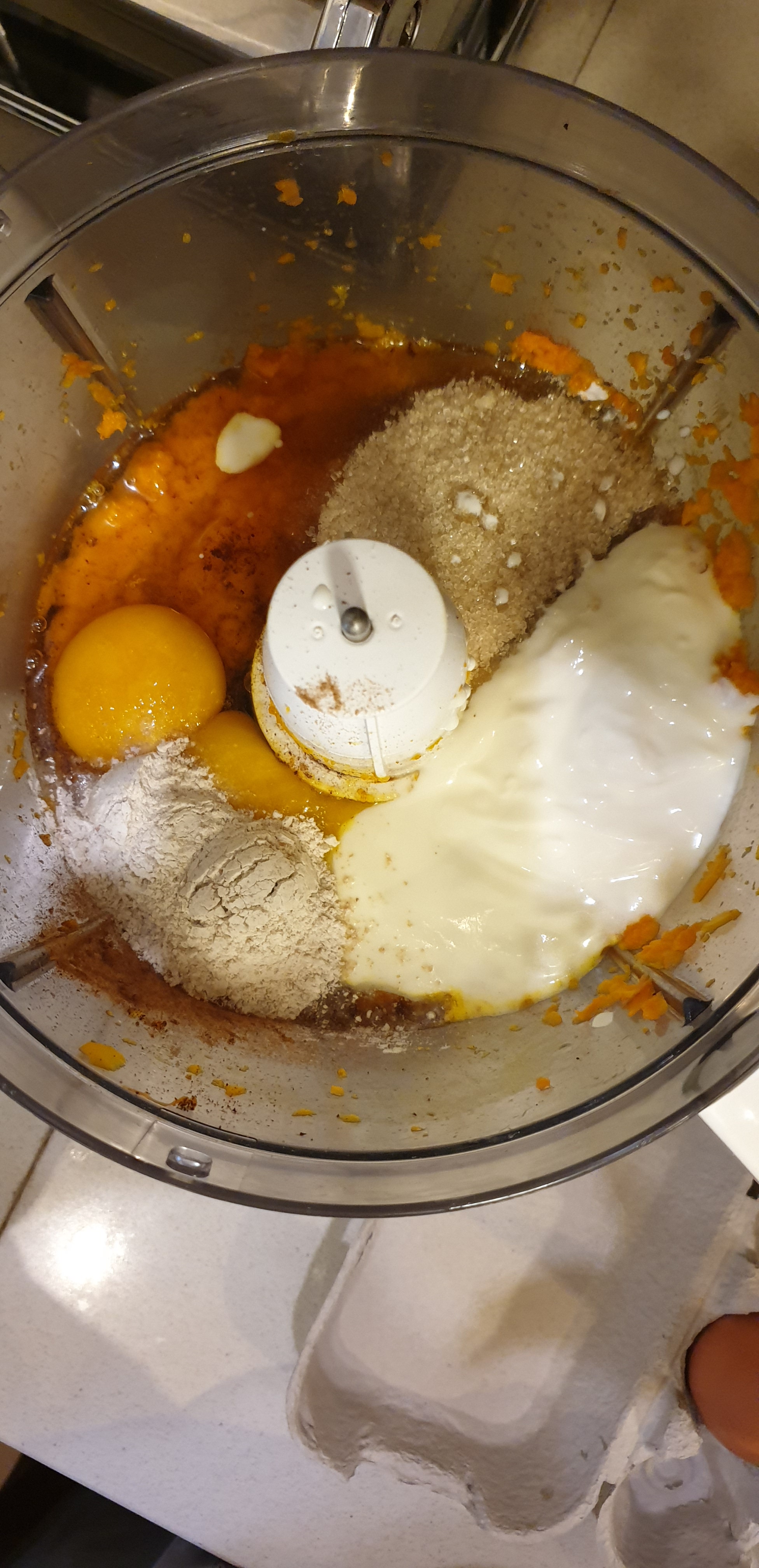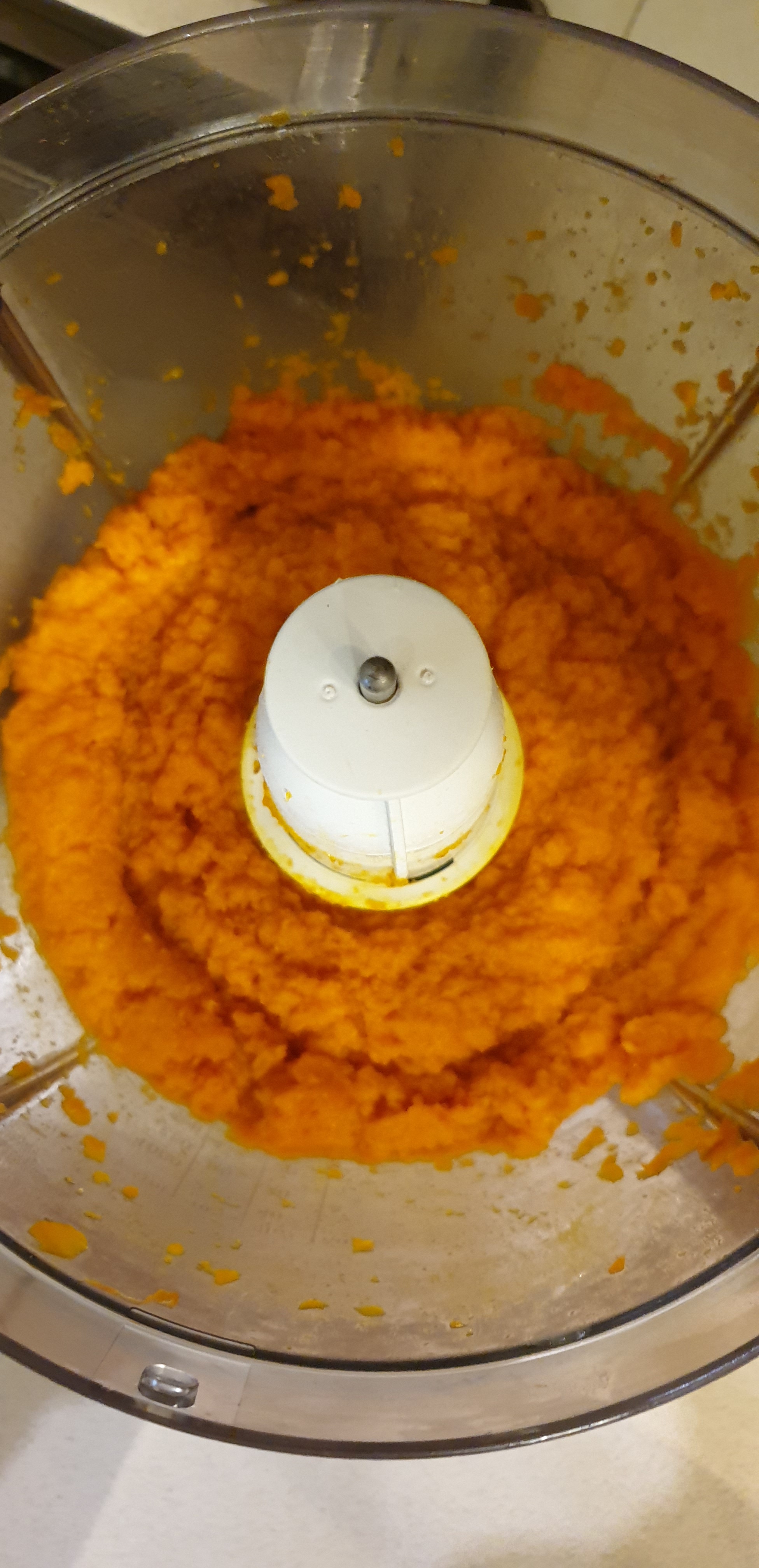 - Pasi që të jenë ftohur karrotat, pra që të mos ketë rrezik se do të piqen vezët që do ti përdorim në recetë, së pari e lëshoni furrën të nxehet në 175°C, dhe filloni me pregatitjen. I qitni karrotat në mikser për bluarje së bashku me puterin/gjalpën dhe i bluani mirë duke i shtyer poshtë copat që mbeten lartë deri sa të bëhet një pure e njëtrajtshme