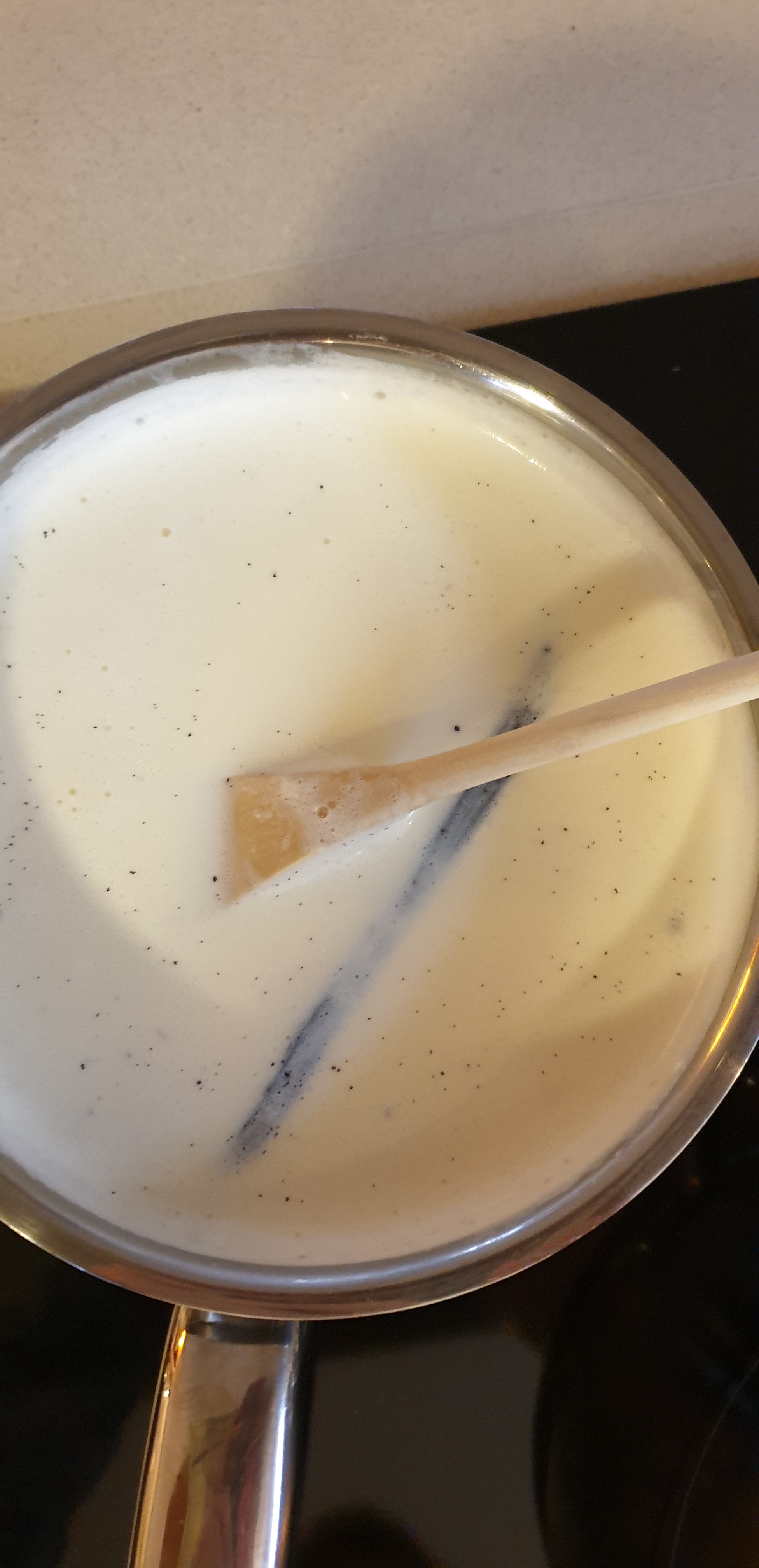 - E nxeni tamlin/qumështin me bishtajën e vaniles (nëse përdorni bishtajë) vetëm deri sa të merr valë duke u kujdesur mos të digjet në fund. E leni anash të ftohet