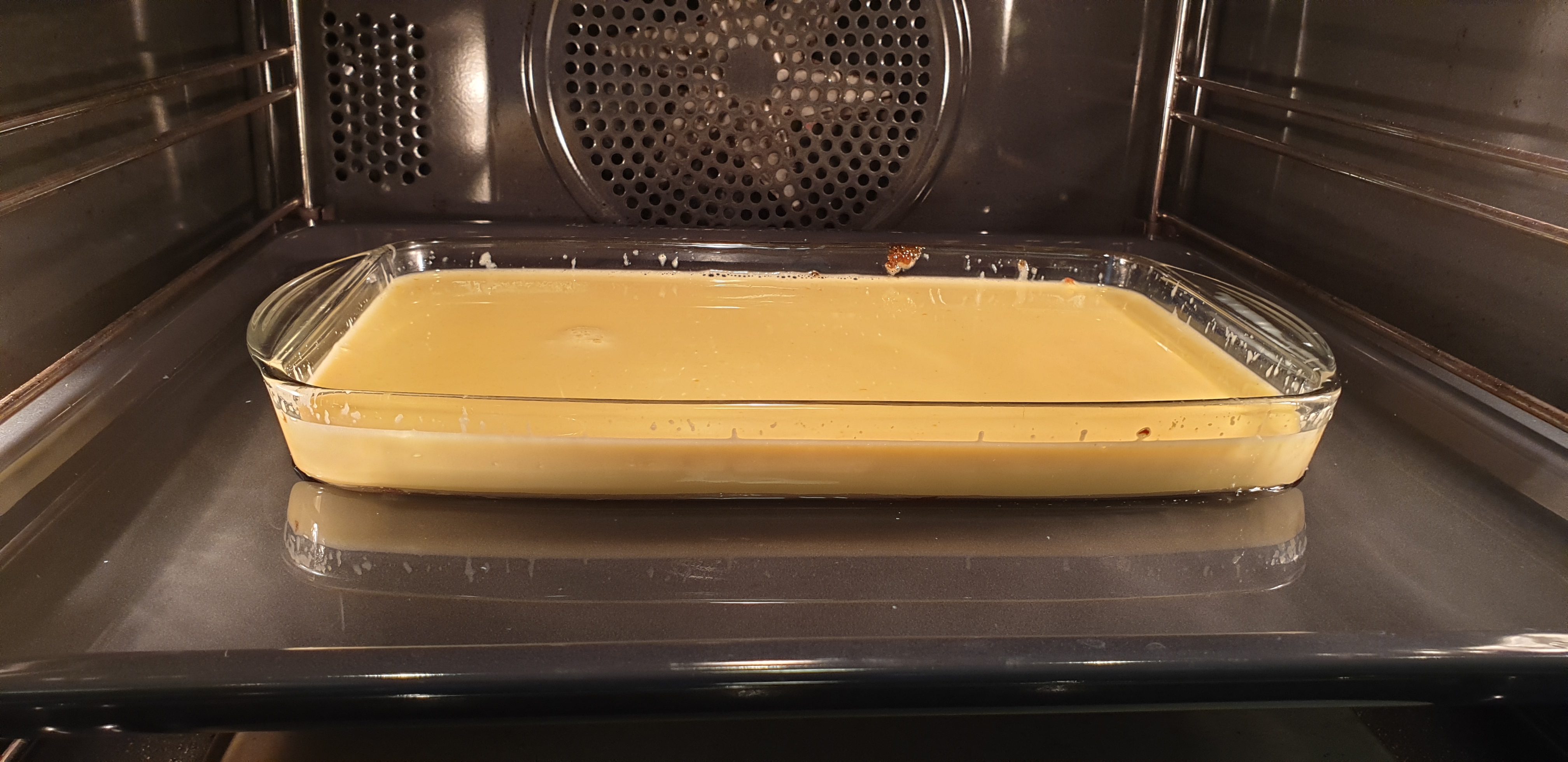 - E leni të piqet 45 minuta në enë individuale deri në 1 orë në tepsi. Kur jeni kah fundi, kontrollojeni që të mos e leni ujin të vlojë, dhe, nëse vëreni se ka mundësi të fillon vlimi, ia ulni temperaturën për 10°C deri 15°C. Pra uji nuk guxon të vlojë në asnjë moment