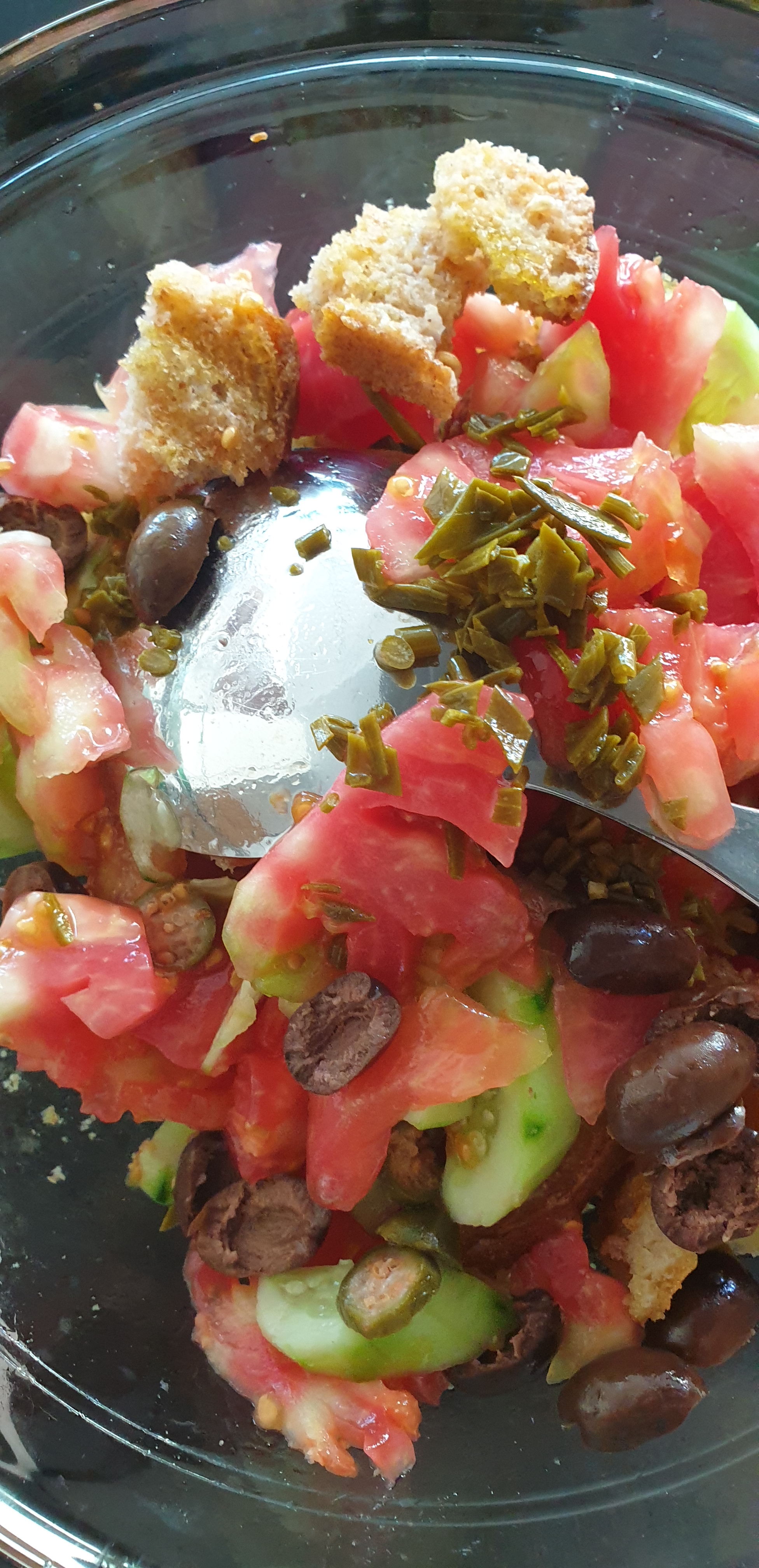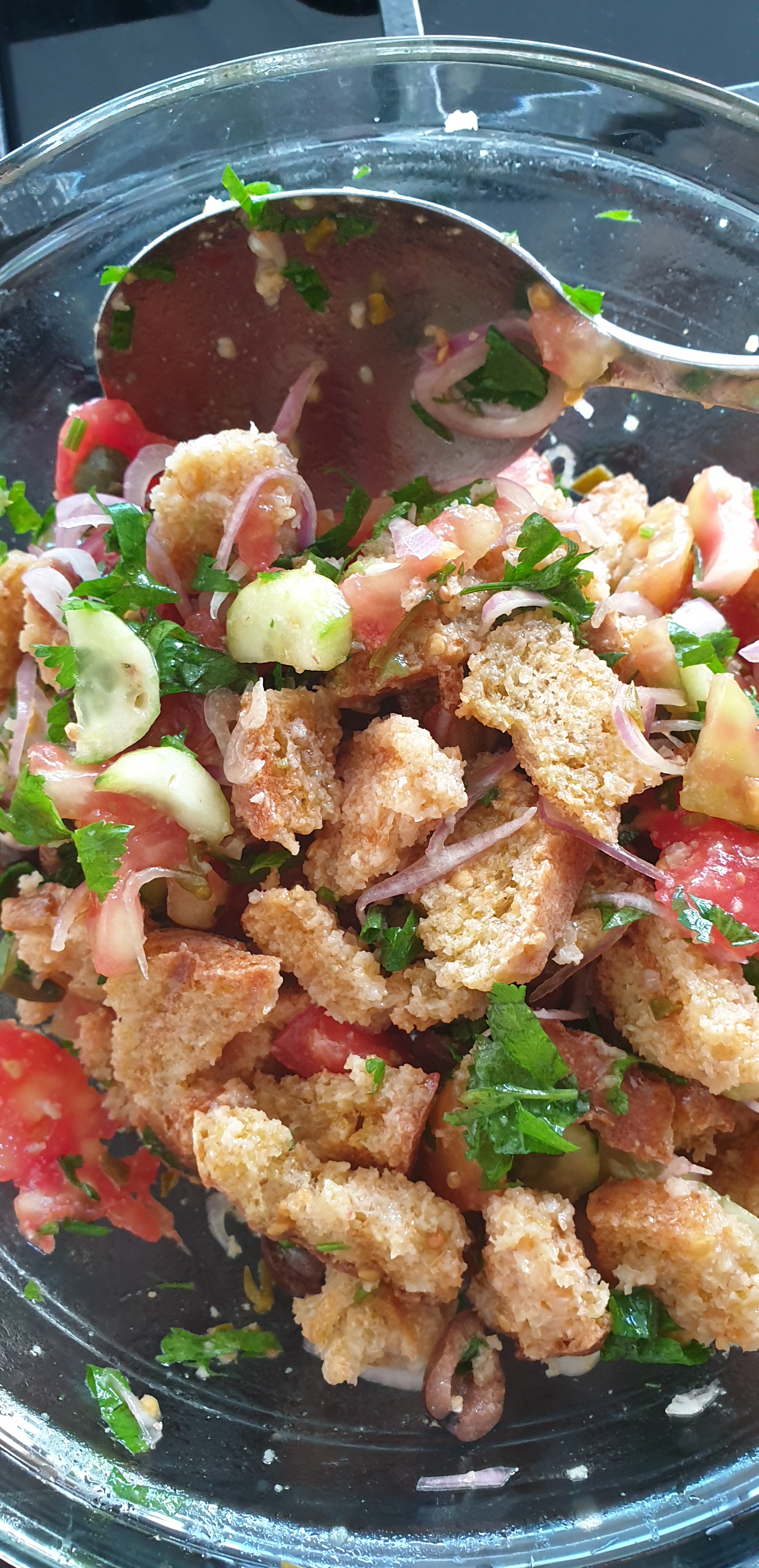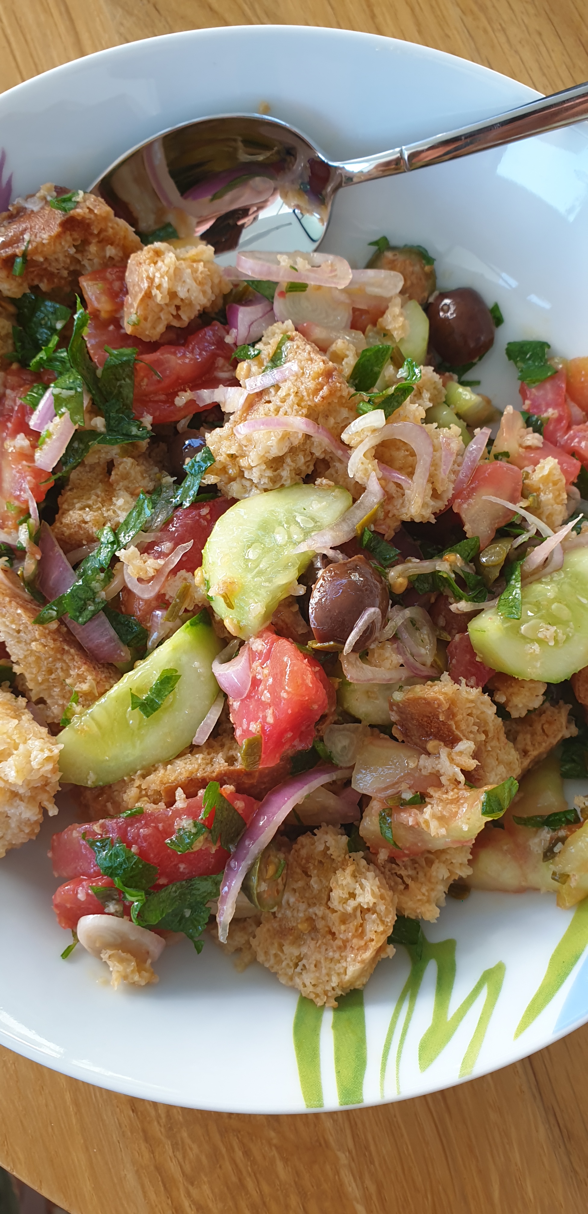 Kur ju mbetet ndonjë bukë e mirë, që është e thatë po jo e prishur, dhe ju dhimbset që ta hudhni, është ide e mirë që ta përdorni për sallatë që mund të servohet për mëngjes gjatë verës. Është shumë e lehtë dhe tepër freskuese. Mund ta hani edhe në darkë por mua më pëlqen shumë në mëngjes.