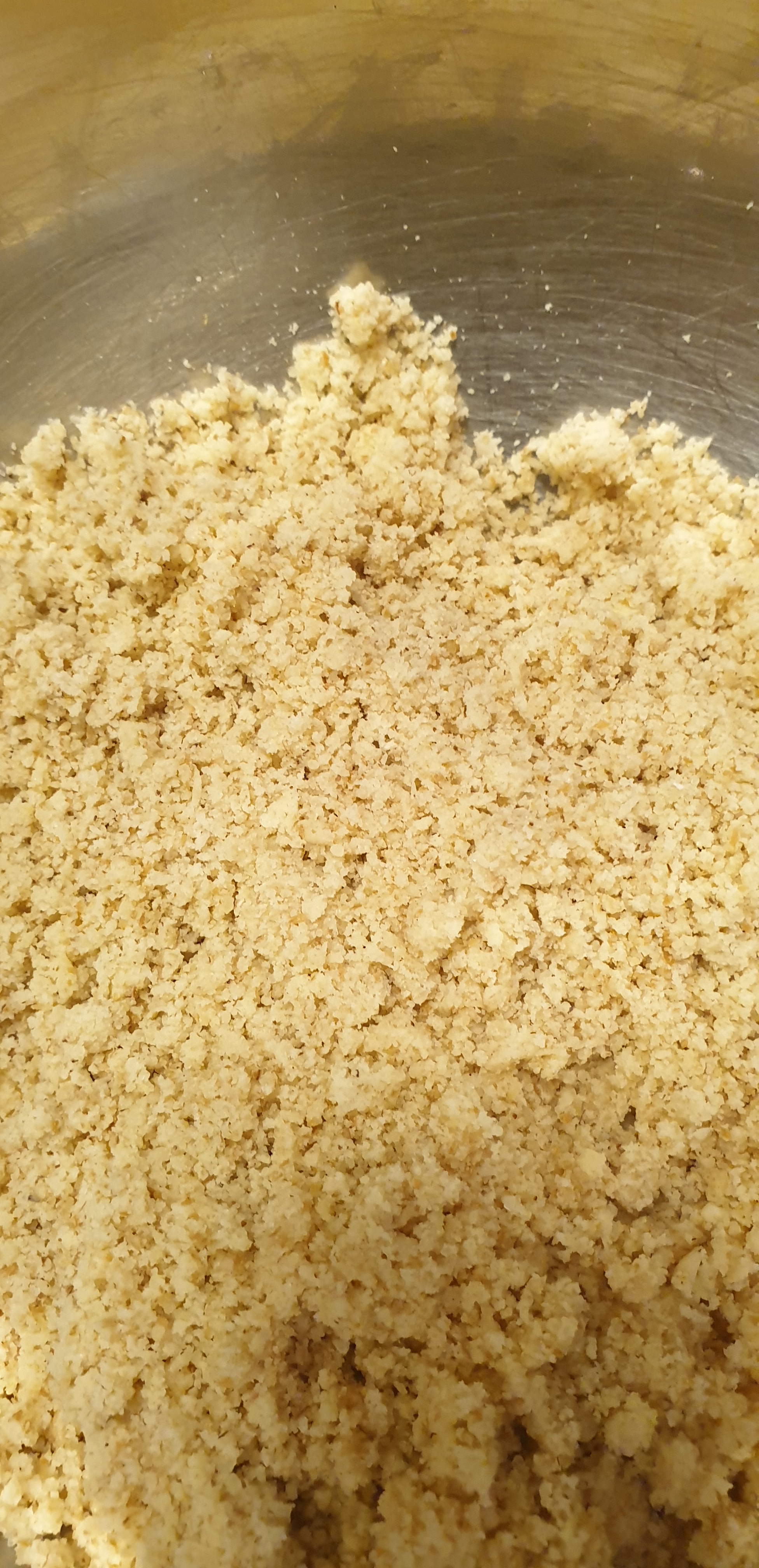 - Sitni miellin me pluhurin për ëmbëlsira në një enë të thellë, i shtoni sheqerin dhe pak kripë. I përzieni mirë dhe ia qitni puterin/gjalpin e ftohtë të coptuar në katrorka të vogla. Me duar e shtypni puterin dhe e përzieni me miell deri sa të duket si miell misri, pra kur puteri/gjalpi bashkëdyzohet në miell