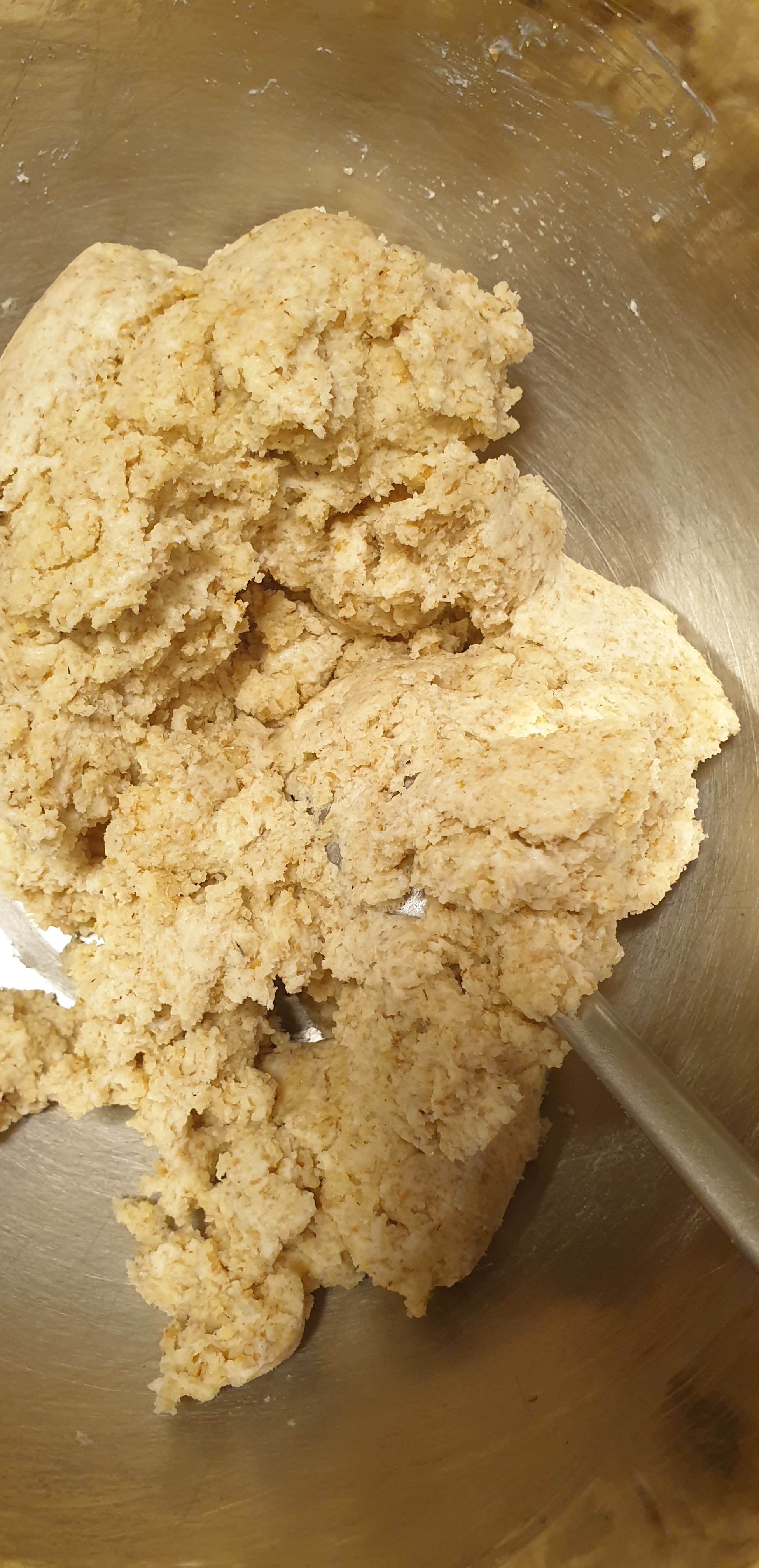 - Tani merrni një pirun dhe duke përzier i shtoni jogurtin dhe e përzieni vetëm deri sa të fillon brumi të bashkohet. Mos e punoni shumë brumin që të mos aktivizohet gluteni, pasi që duhet që brumi të jetë shkriftë