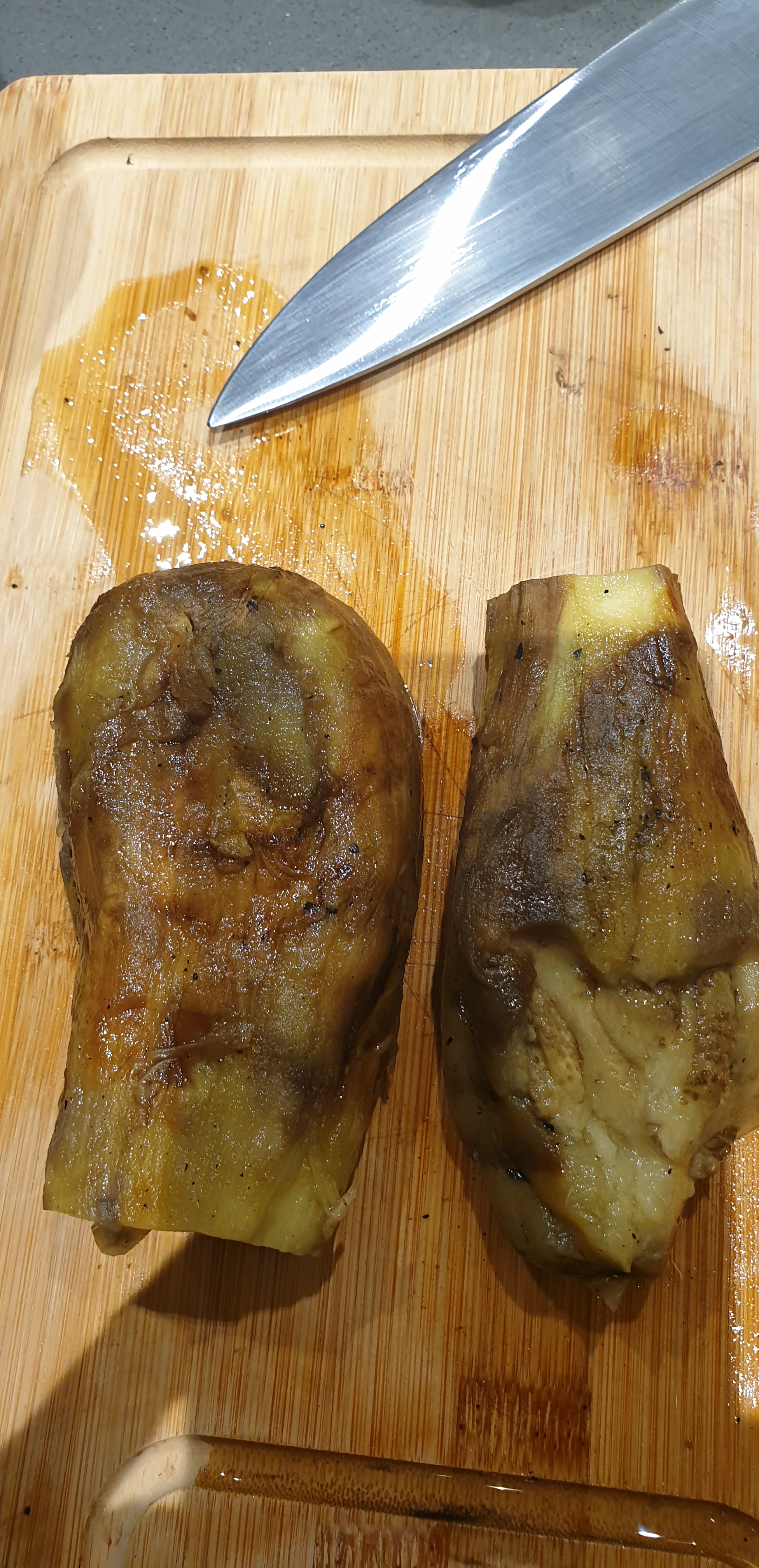 - Nëse nuk doni që ta bëni me shije tymi, i shponi patëllxhanët me thikë dhe i qitni në një enë, i pjekni në furrë në temperaturë 200°C për afro 30-40 minuta ose deri sa të zbuten mirë. Aty mund të shtoni edhe një kokë të vogël apo gjysëm koke të hudrës, të paqëruar, që të piqet, nëse doni shije më të butë të hudrës