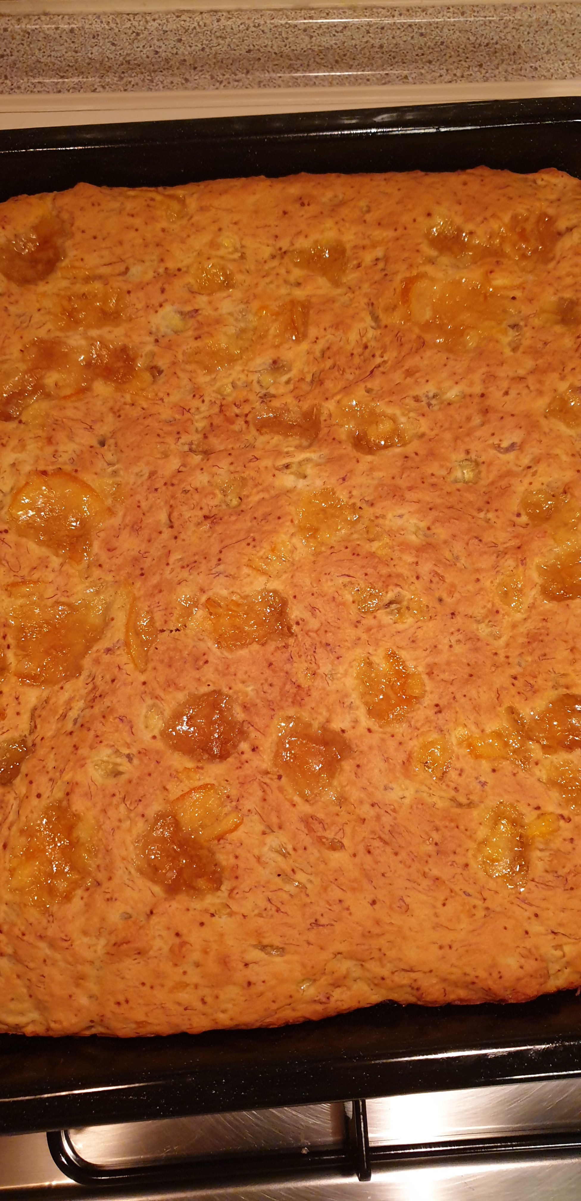 - Nëse e pjekni në tepsi, e hapni brumin mirë me lugë dhe ia shtoni reçelin/marmelatën