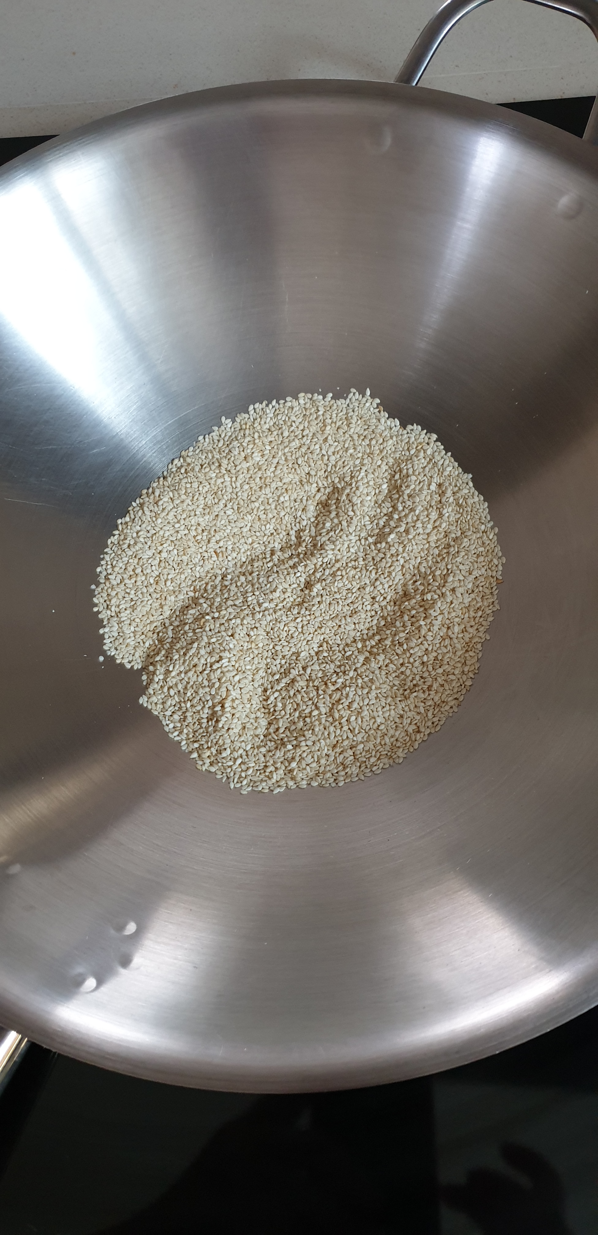 - Në një fërtere metalike i pjekni pak farat e susamit duke u kujdesur që të mos teprohet. I përzieni vazhdimisht deri sa të ndjeni aromën dhe i largoni. Susami digjet shumë shpejtë prandaj i mbani vetëm pak deri sa të djersiten