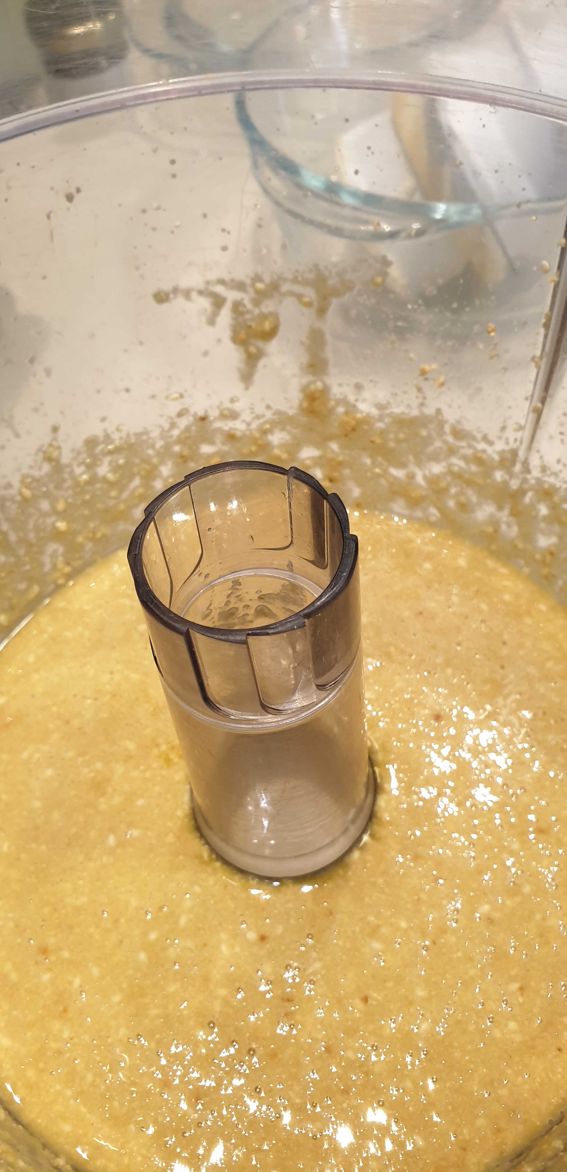 - I leni të ftohen dhe pastaj i qitni të gjitha në mikserin me thika dhe i bluani deri sa të shifni që ka filluar të ngjitet anash mureve. E ndërpreni dhe i shtyni me një shpatull që të bluhen mirë. I bluani edhe pak dhe filloni ti shtoni vajin duke vazhduar bluarjen deri sa të bëhet masa e njëtrajtshme. Nëse ju duket shumë e thatë i shtoni edhe pak vaj