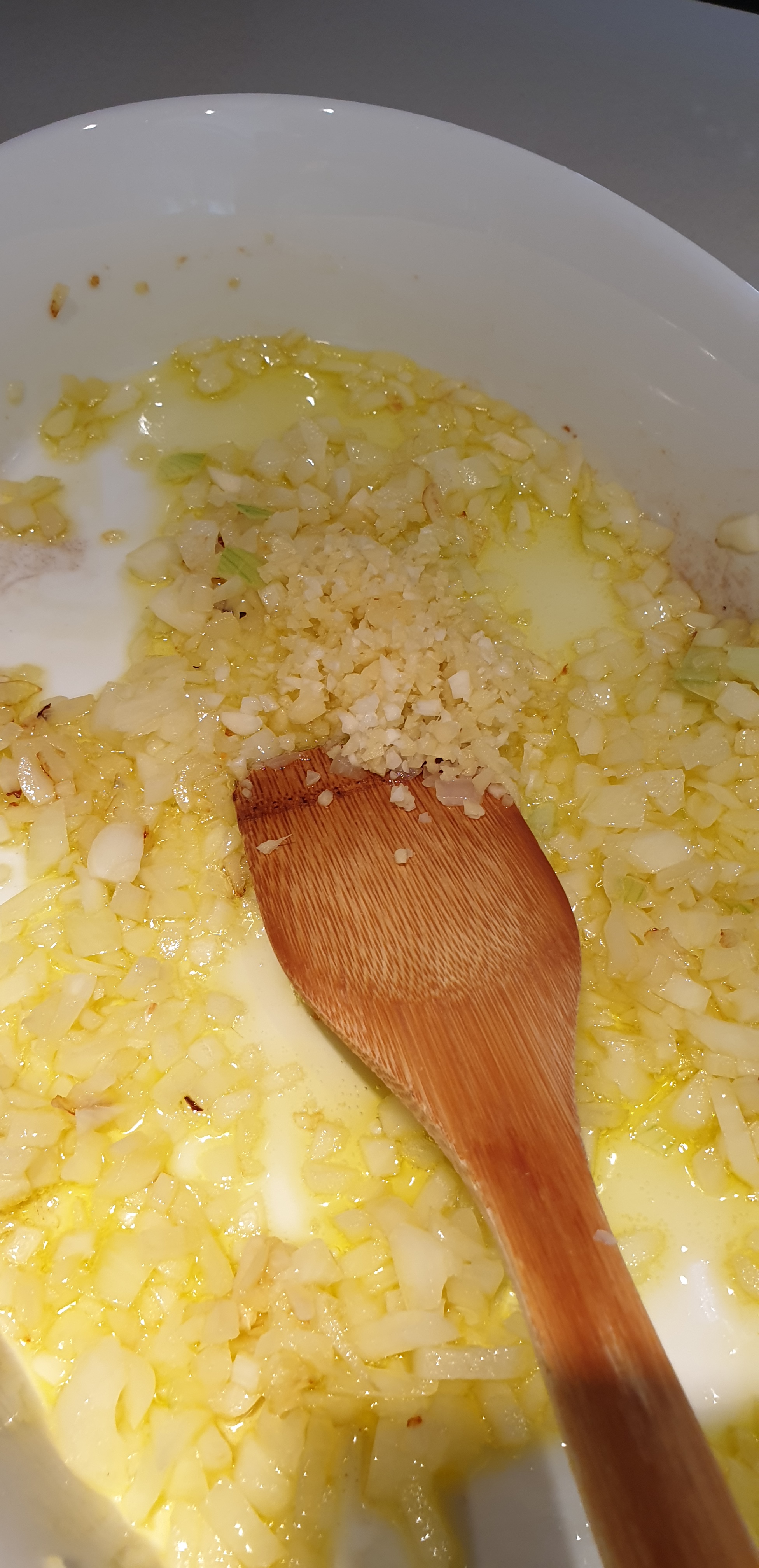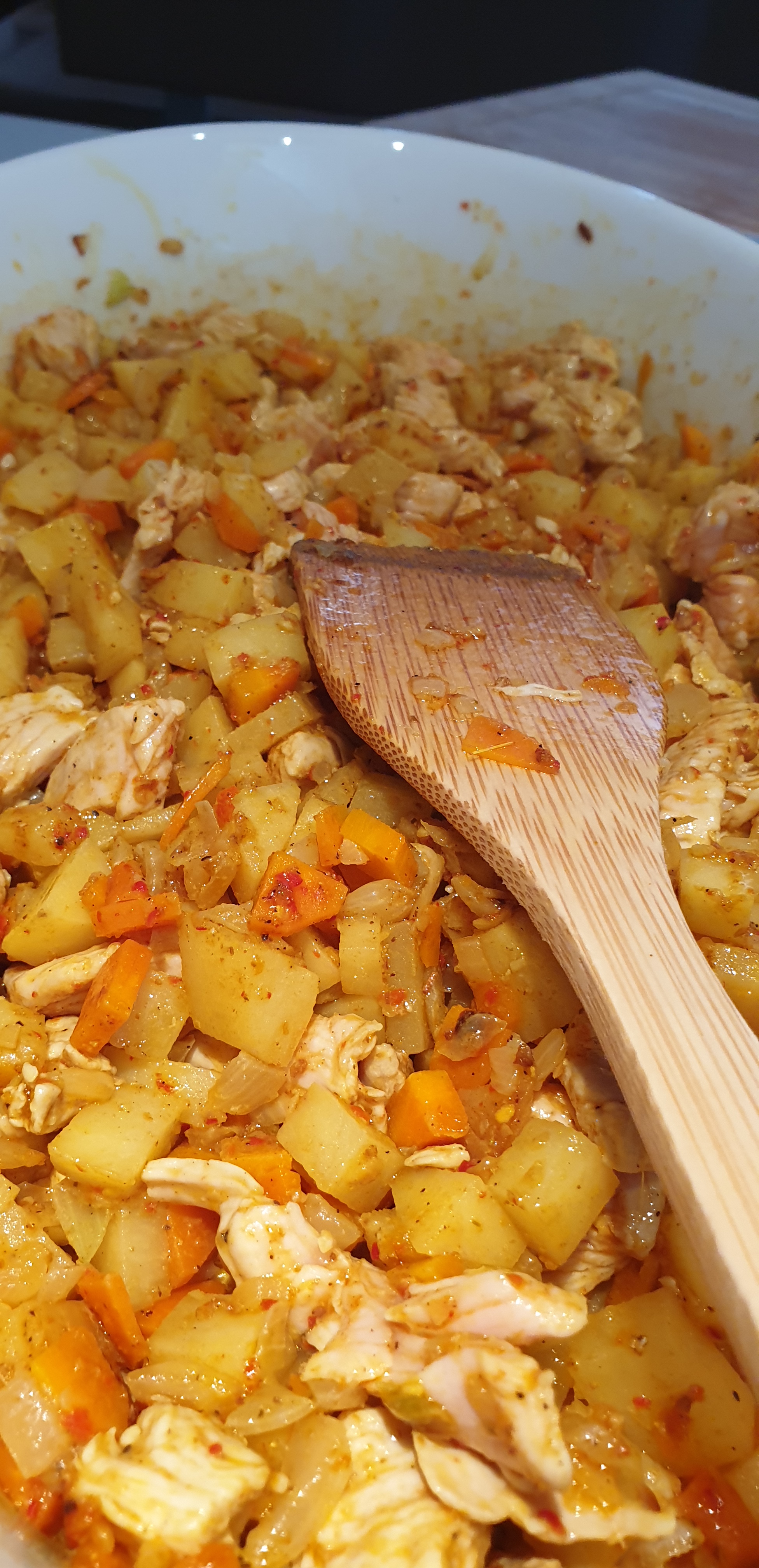 - Së pari i pastroni, qëroni dhe grimconi të gjithë përbërësit. Qepa duhet të grihet mesatarisht imët, hudrat me xhenxhefilin i grimconi së bashku imët. Pataten e qëroni dhe e preni në katrorë në madhësi të njejtë, poashtu edhe karrotën në madhësi të ngjajshme me pataten. Gjethet e spanaqit (apo cilatdo gjthe që i prdorni) i pastroni mirë dhe i këpusni bishtat, nuk ka nevojë të grimcohen përpos nëse janë të mëdha