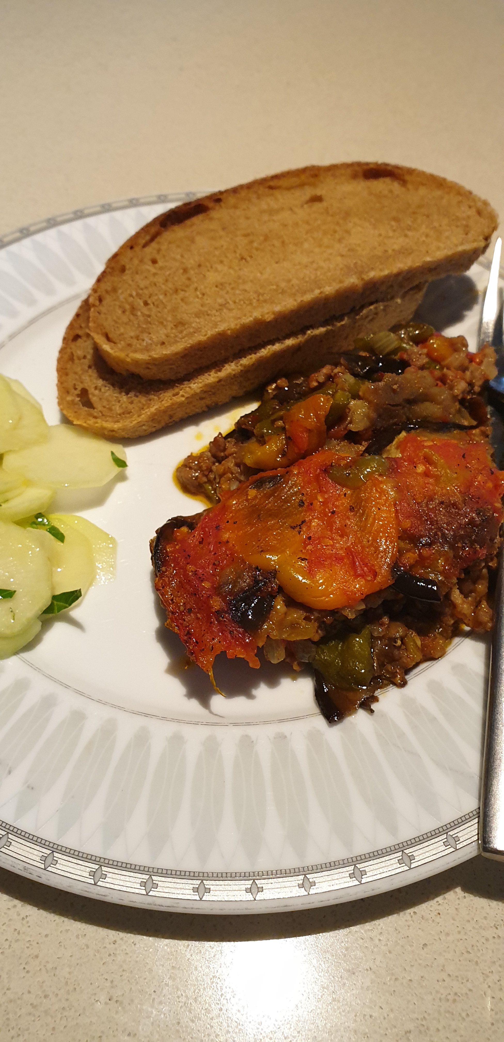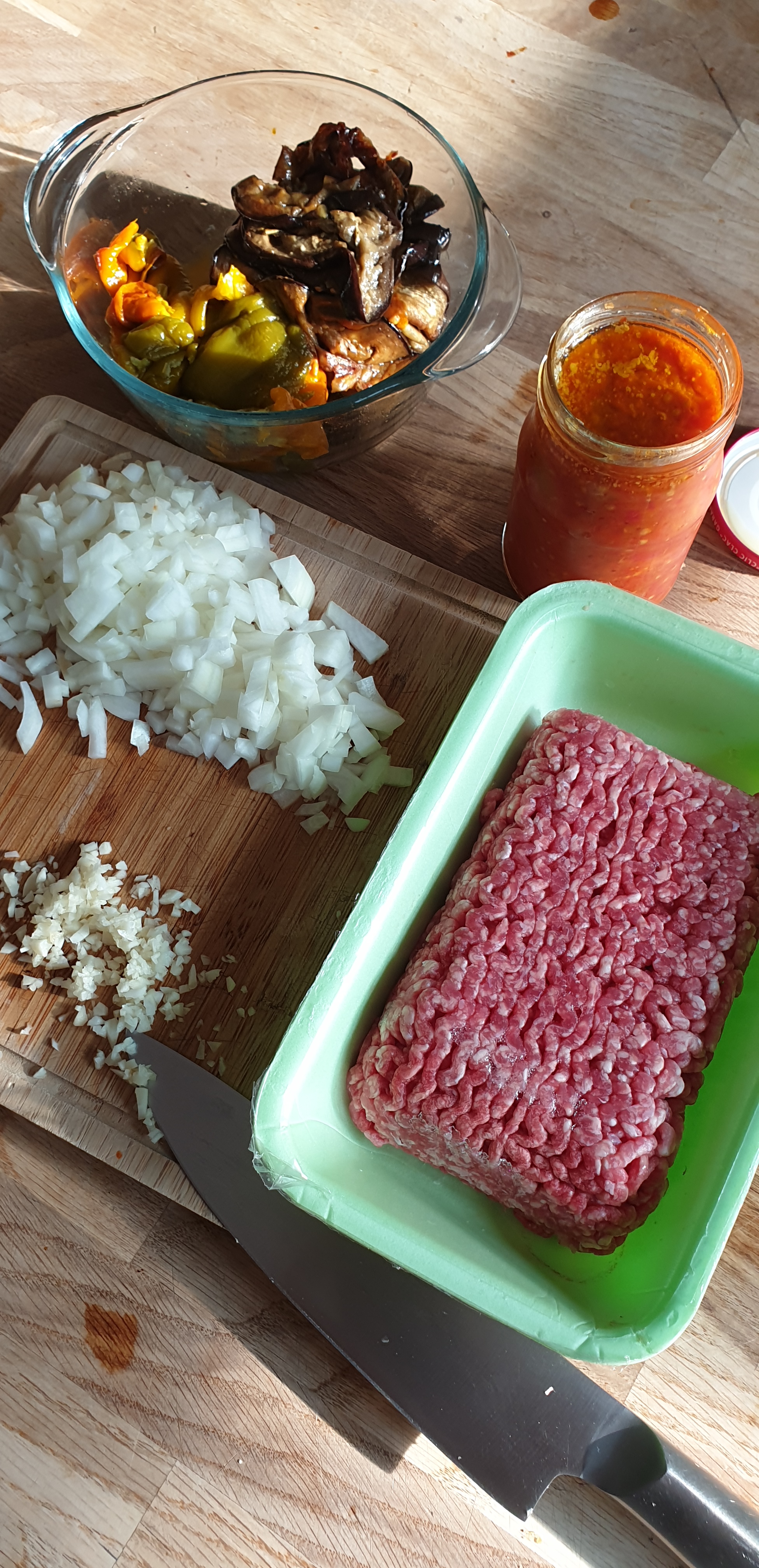 Ky është verzioni im i këtij specialiteti ballkanik që ka verzione të ndryshme varësisht se ku bëhet. Kjo recetë ëshë në mes të musakasë dhe Imam Baildi. Musaka si princip kërkon beshamel e që kjo nuk e ka, derisa Imam Baildi bëhet pa mish e kjo ka mish.