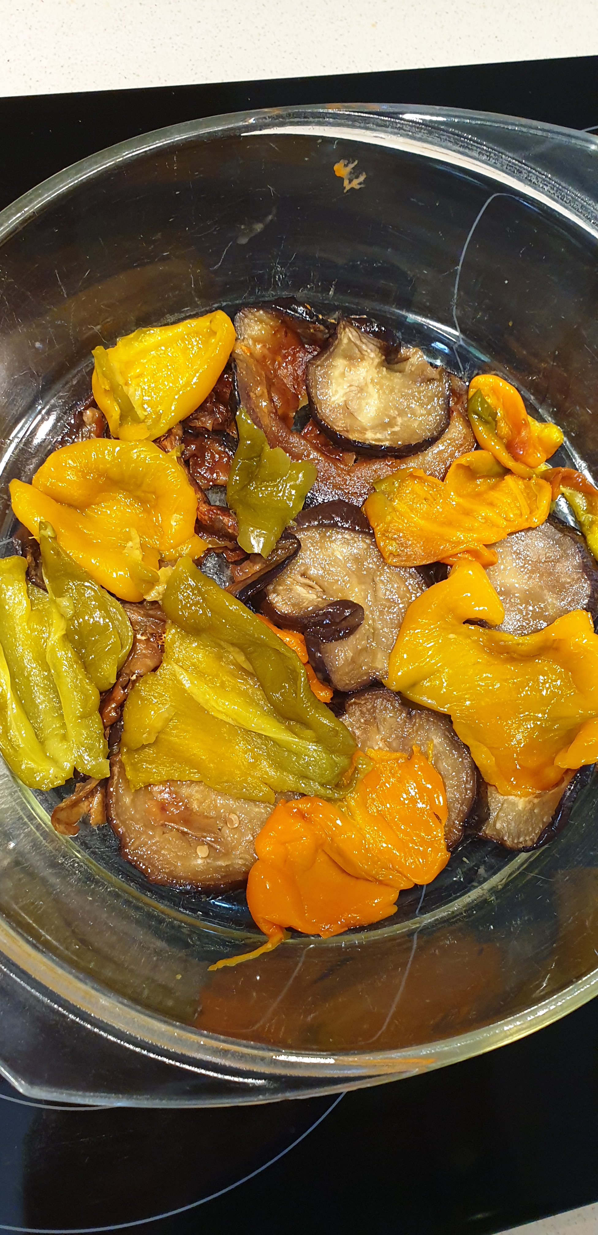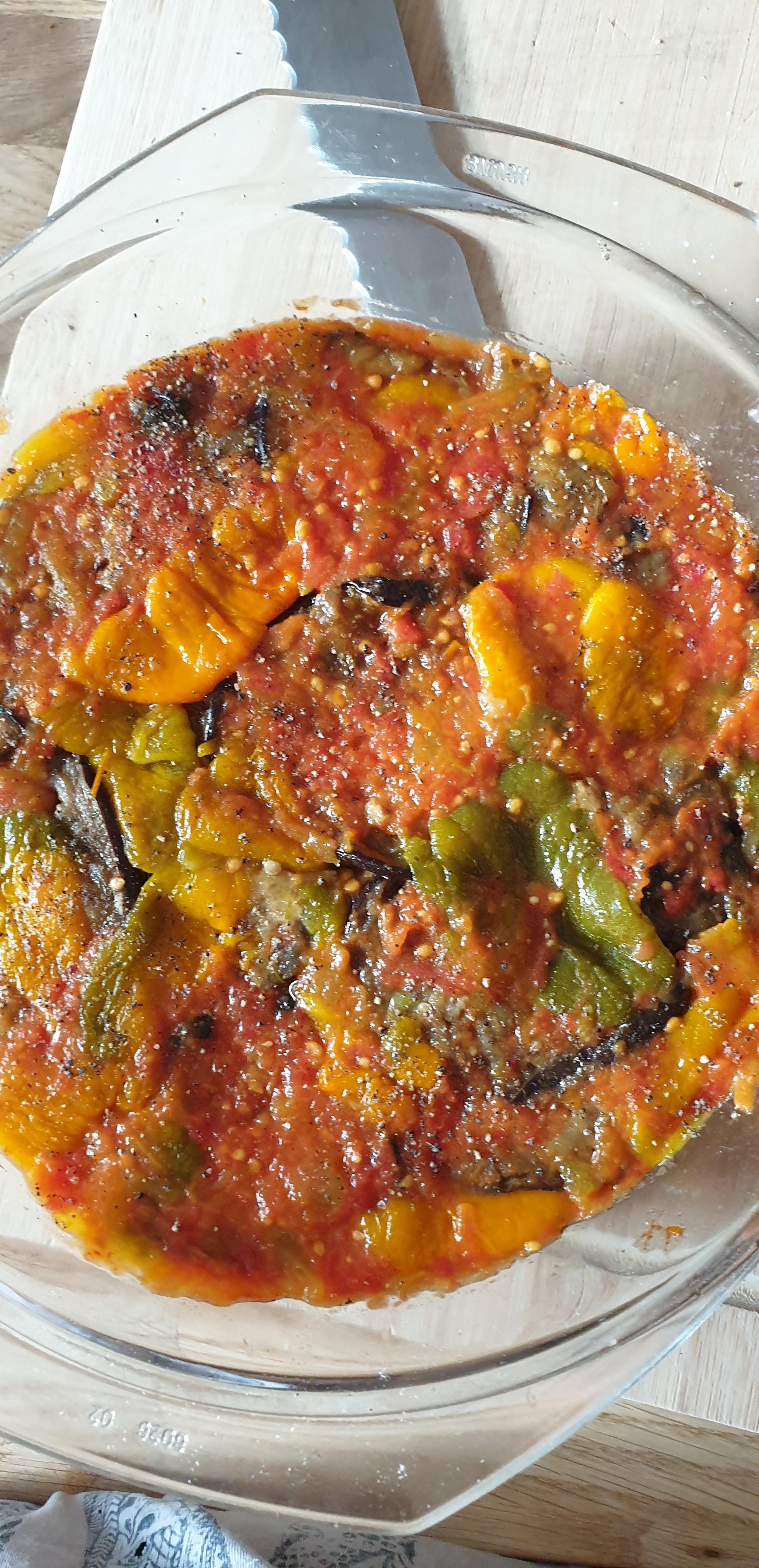 - Posa që të skuqen patëllxhanët dhe të pjeken specat e mbyllni furrën (ose e mbani hapur në 180°C) dhe i nxjerrni jashtë. Posa të ftohen specat pak i qëroni dhe iu largoni farat