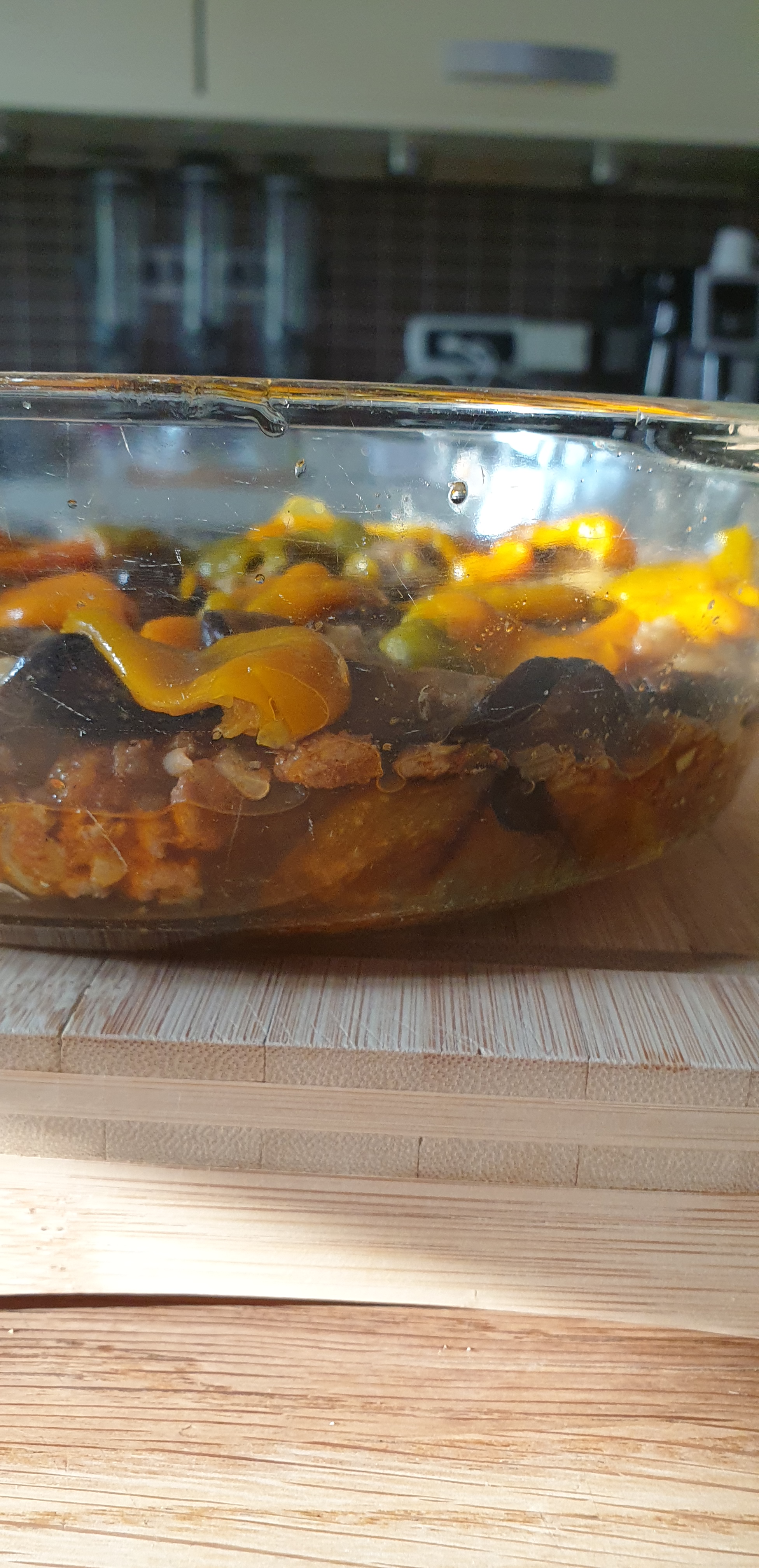- Në një enë të qelqit apo të metalit i renditni në fund gjysmën e patëllxhanëve dhe specat. Mbi to e hapni mishin dhe e rrafshoni mirë. I shtoni edhe pjesën tjetër të patëllxhanëve dhe specave dhe e lyeni me dy lugë salcë të domateve që ta ruajë lagështinë dhe mos të thahet në furrë