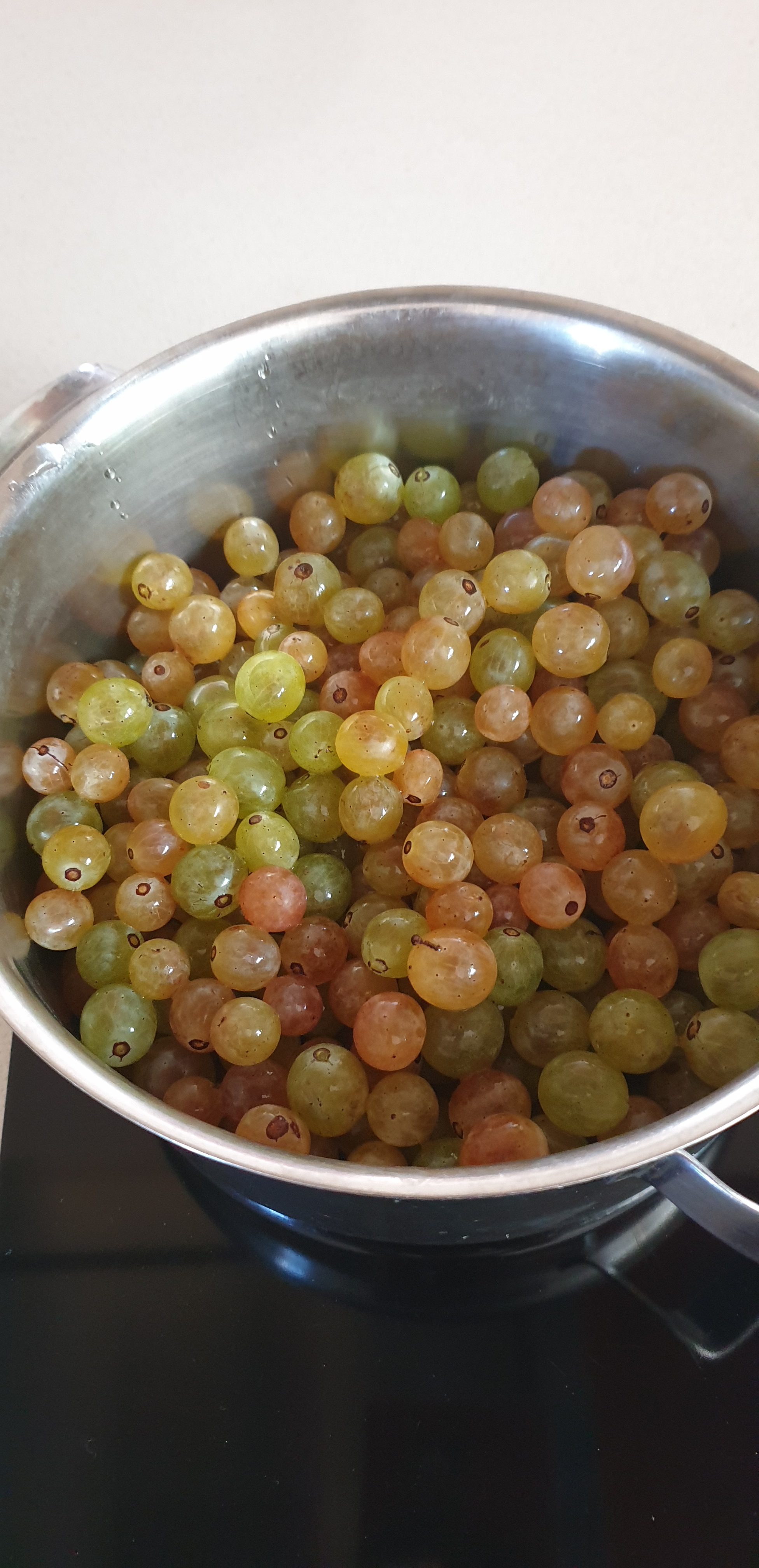 - E pastroni rrushin nga kalaveshi dhe e shpërlani. E kulloni mirë dhe e qitni në një tenxhere të vogël me ujin që të zihet në temperaturë të lartë. Posa të merr valë, e ulni temperaturën në mesatare dhe e leni të mbyllur me kapak që të zihet dhe të zbutet. Herë pas here e kontrolloni që mos të ngjitet në fund. E zieni për afro 30 minuta apo deri sa të ndahen farat nga rrushi dhe vëreni që kokrrat kanë filluar të zbuten tërësisht