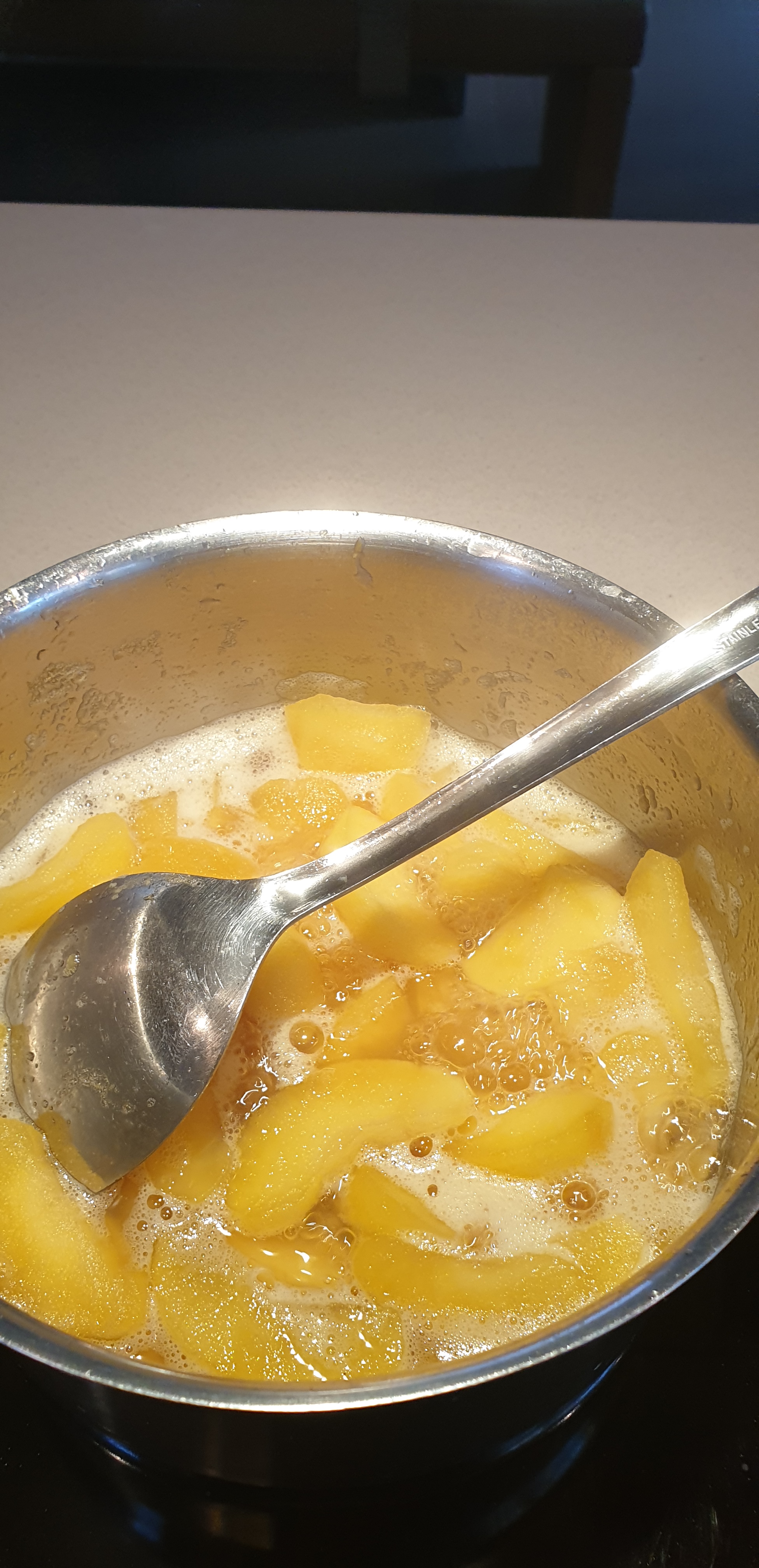 - I lani dhe i qëroni mollat dhe i preni në flegra. I qitni së bashku me lëngun e rrushit dhe i ktheni në zjarrë të lartë deri sa të marrin valë. Posa të fillojnë të vlojnë e ulni temperaturën në mesatare, i mbuloni me kapak dhe i leni të zihen për 40 minuta duke e kontrolluar herë pas here
