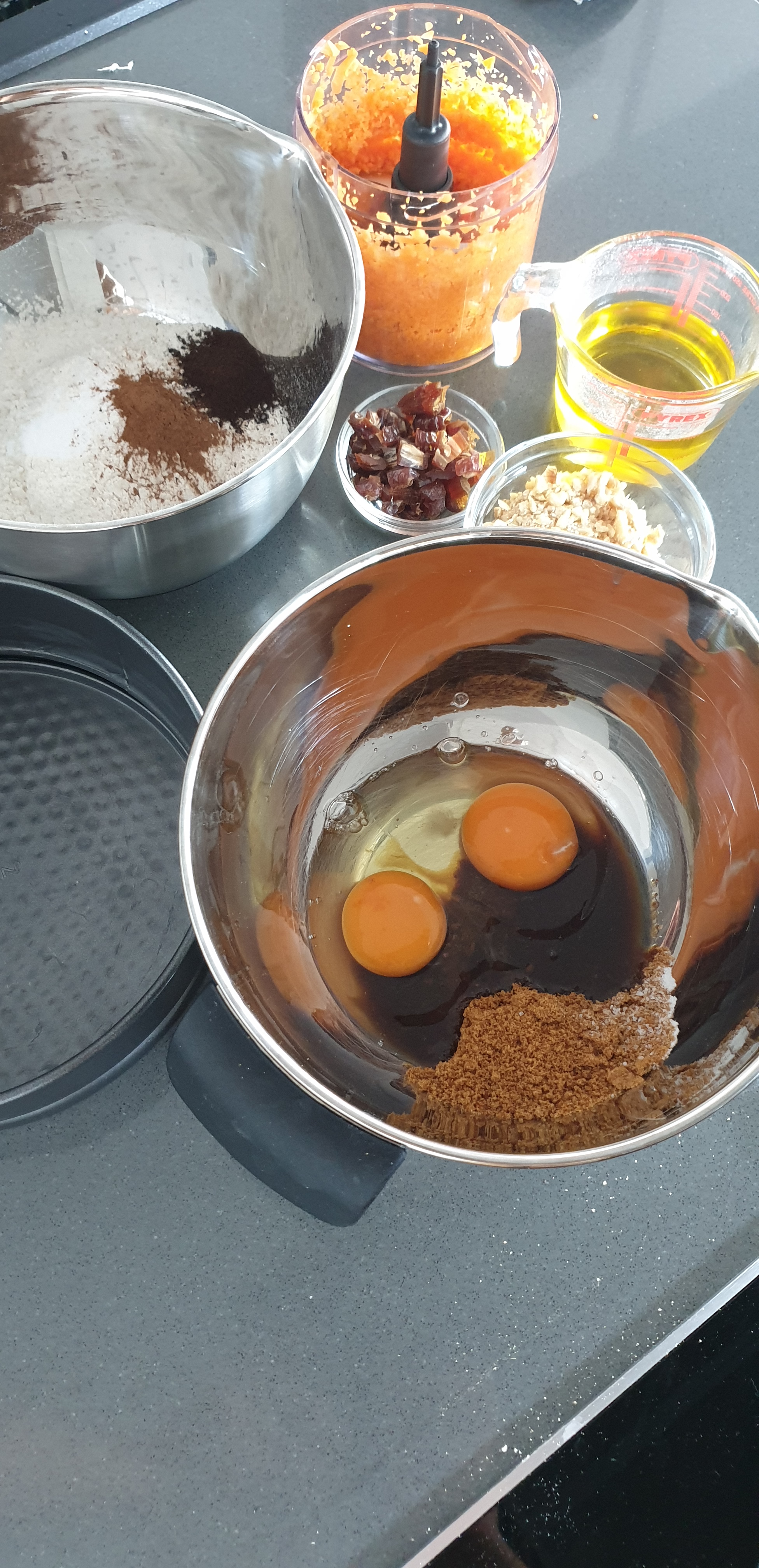 - Tani ia shtoni këtë masë të lëngët miellit dhe i përzieni deri sa të fillojnë të bashkëdyzohen. I shtoni tani karrotat, e përzieni pak dhe ia shtoni arrat me hurmat (apo rrushin e thatë)