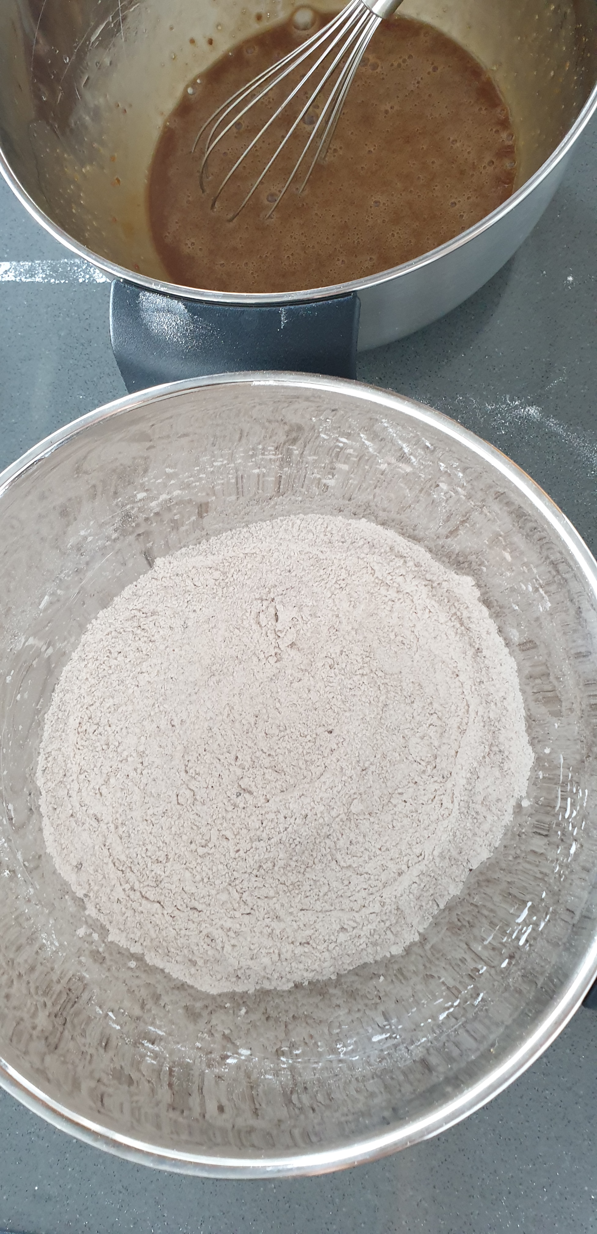 - Në një enë të thellë e përzieni miellin, sodën bikarbone, kripën, kanellën dhe vanilen pluhur ose sheqer vanilen