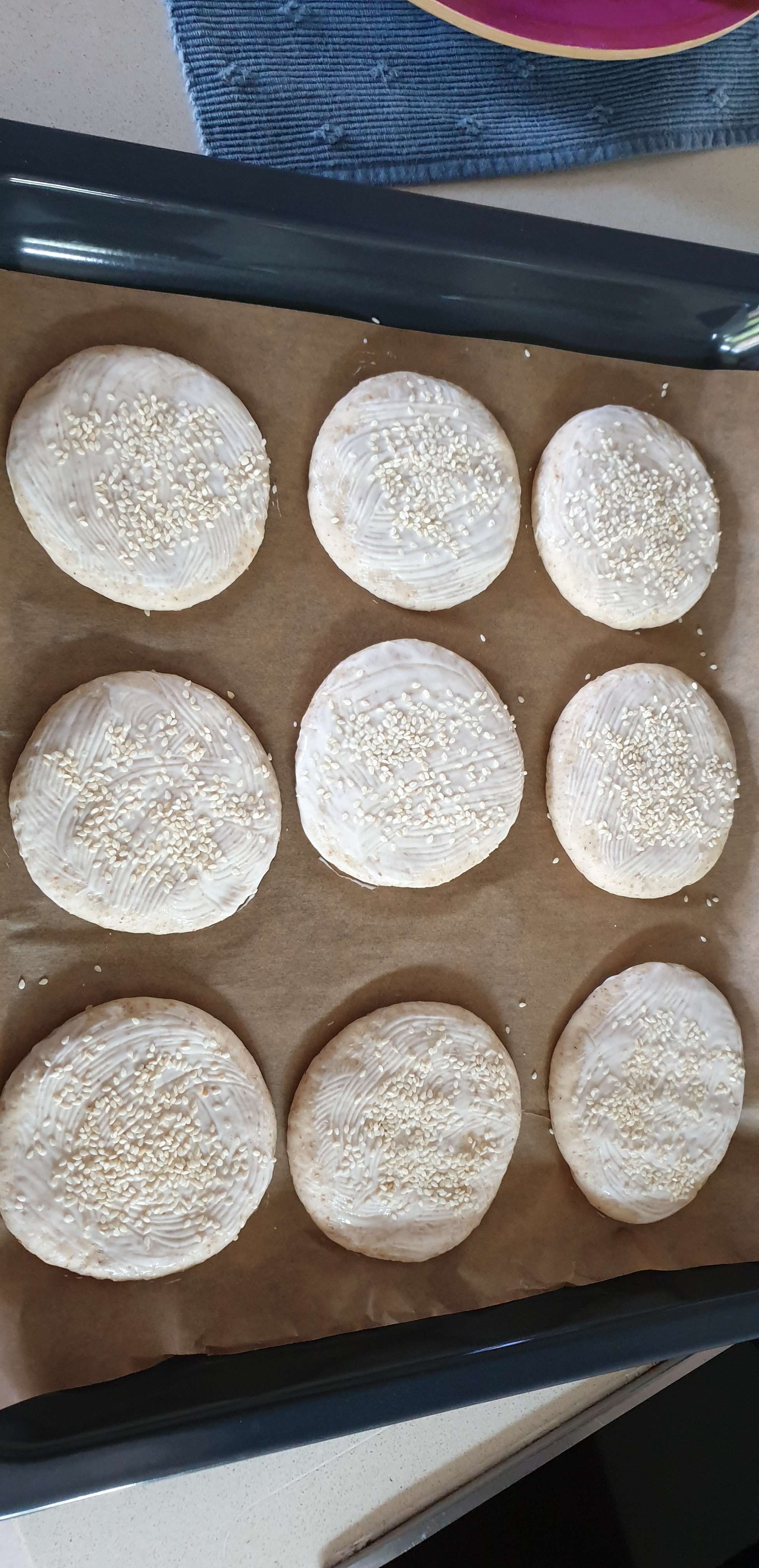 - Pas 1 ore e lëshoni furrën në 200°C dhe në ndërkohë i shtypni kuleçët që të mos jenë të fryera vetëm në mes dhe i lyeni me vezë apo me pak kos dhe i shtoni farat e susamit