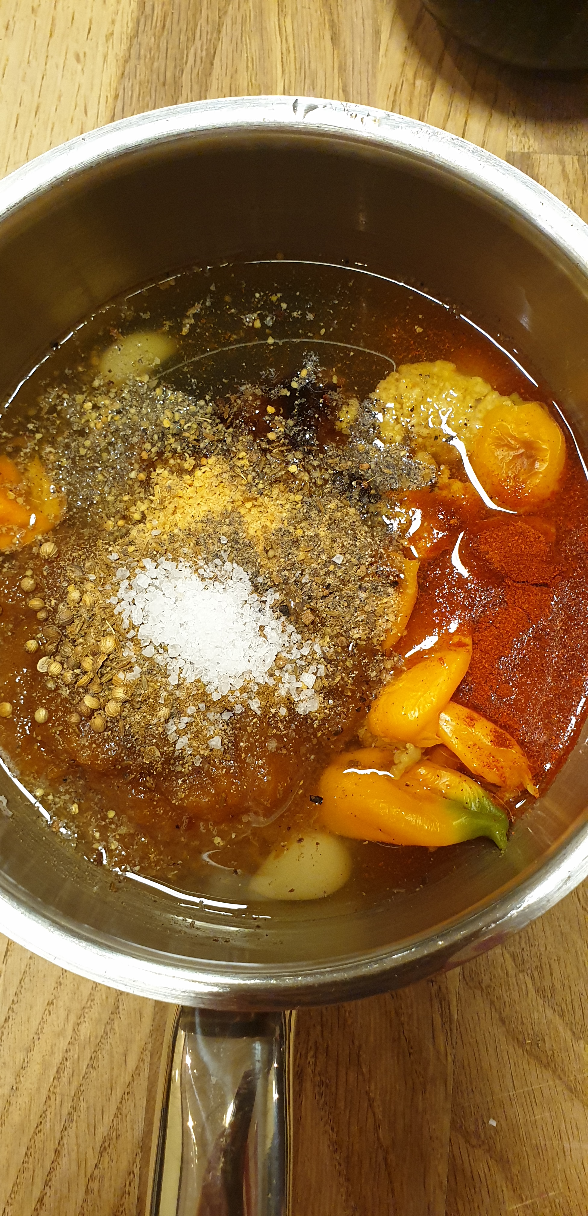 Pasi që habanero specat që i kemi mbjellë kanë shumë frut këtë vit, vendosa të pregatisë edhe një salcë, këtë herë më të hollë, me ndikim aziatik. Është salcë e ëmbël, e thartë dhe e njelmët dhe natyrisht shumë e djegës/pikante. Për ëmbëlsi kam përdorë marmellatë të kumbullave mirabelle, por mund të përdoret edhe kompot i pjeshkës apo marmellatë jo shumë e ëmbël, që të mos teprohet me sheqer.