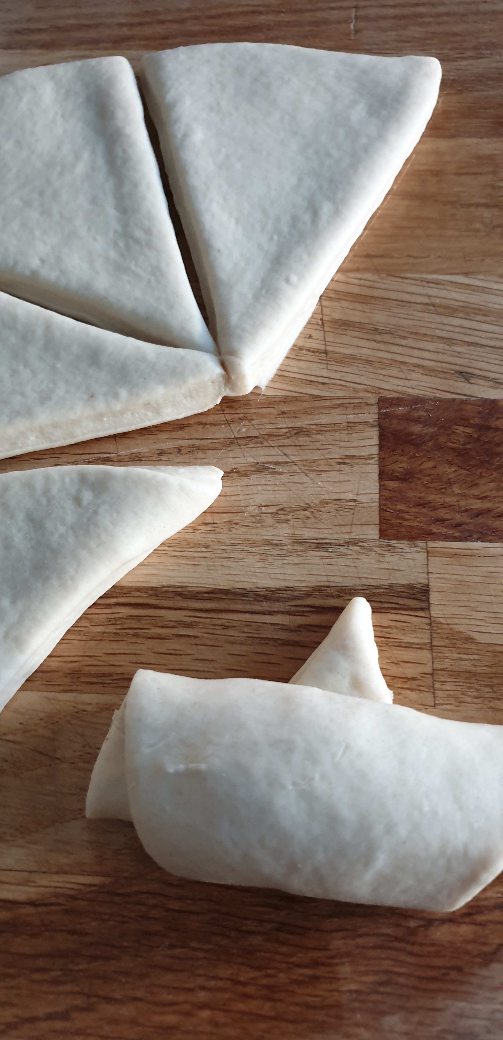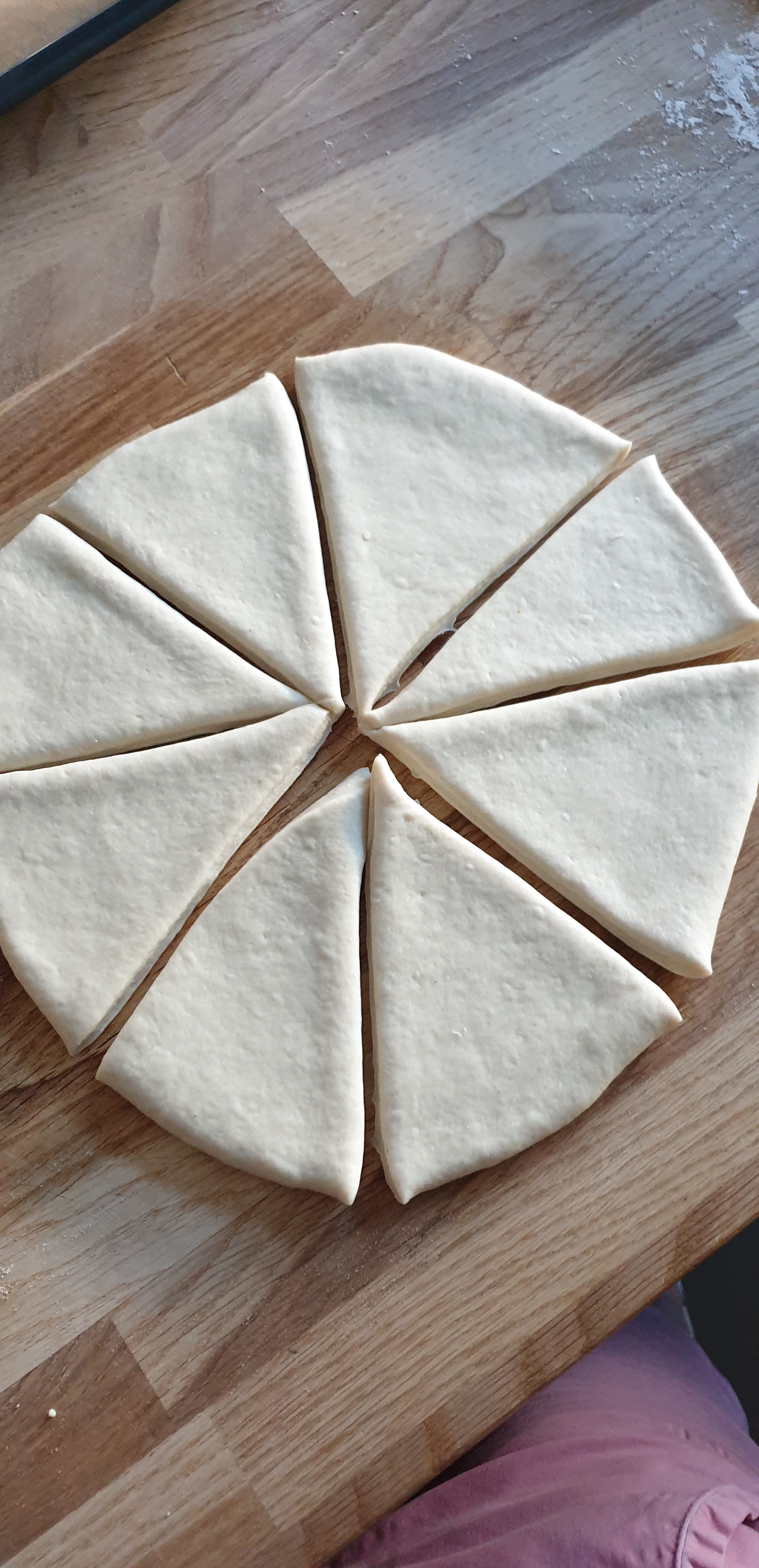 - E hapni brumin me holluese, në tavolinë të punës me shumë pak miell, e preni në 8 pjesë, në formë të trekëndëshave