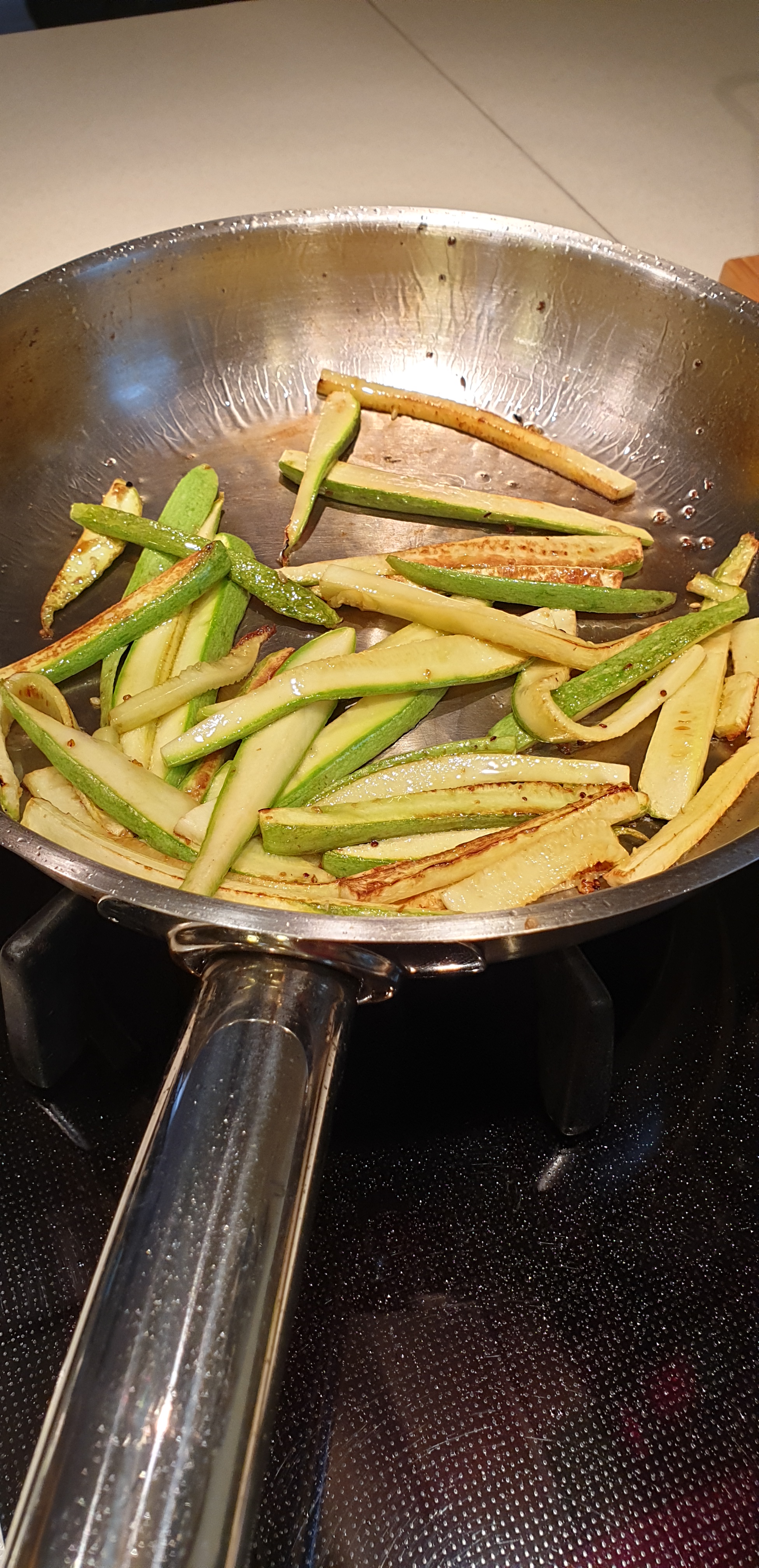 - I rrotulloni, dhe si të vëreni që kanë filluar të skuqen pak, i largoni. E përsëritni deri sa të kryhet e gjithë sasia e kungulleshave. Në fund, i ktheni të gjitha kungulleshat në fërtere përsëri dhe i shtoni salcën. E ndërpreni zjarrin dhe vetëm i përzieni të gjitha së bashku deri sa të marrin shijen e salcës. I qitni në një enë ku do ti servoni. Nëse doni, kungulleshat mund ti zbukuroni me pak fara susami