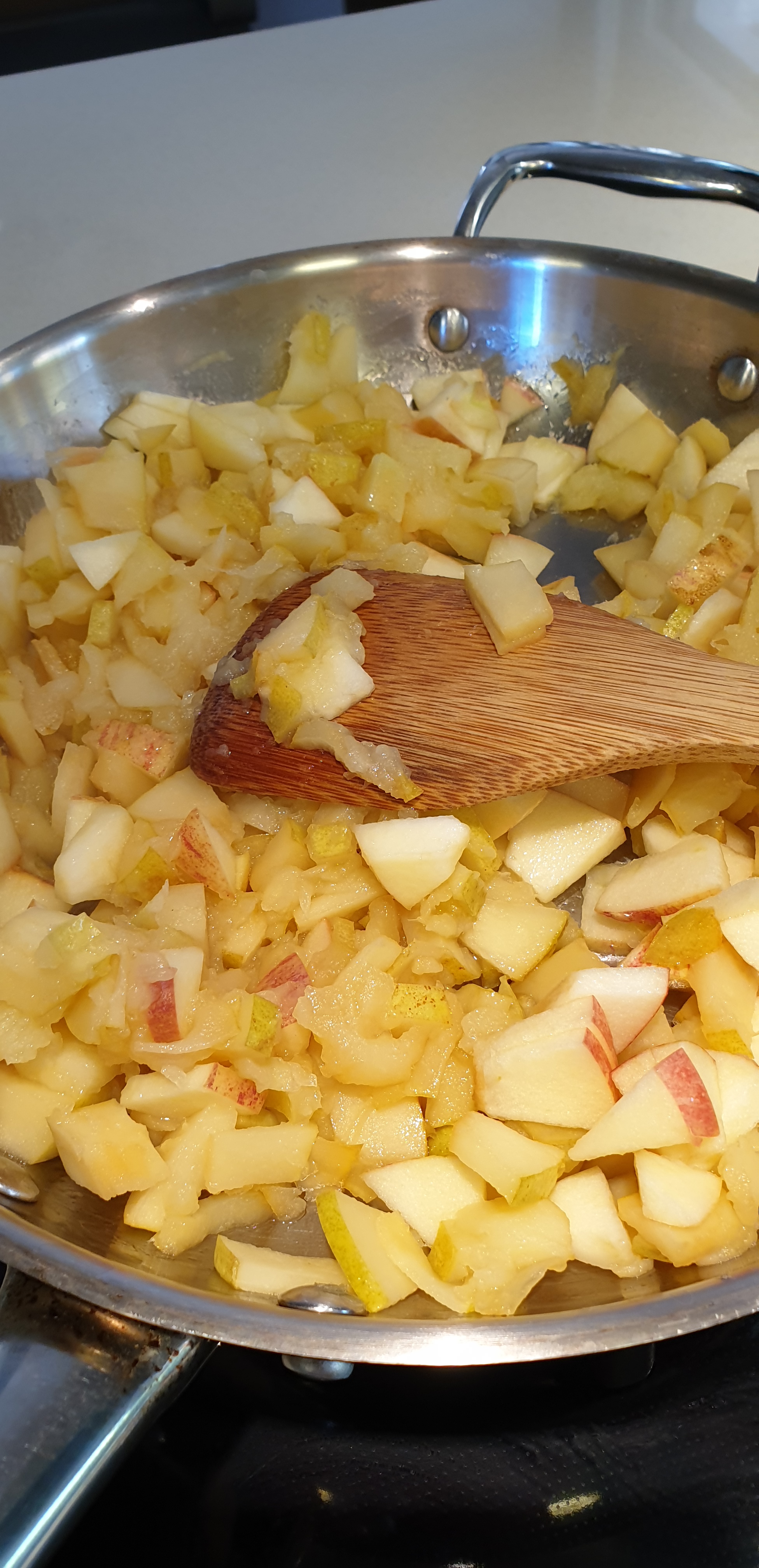 - I coptoni në katrorë të vegjël dhe i qitni në një enë ku do ti zieni. I shtoni lëngun e limonit dhe sheqerin dhe i zieni për afro 5 minuta në temperaturë mesatarisht të lartë. Nëse ju duket shumë e thatë i shtoni shumë pak ujë vetëm sa mos të digjet. Në fund i shtoni kanellën dhe e largoni nga zjarri