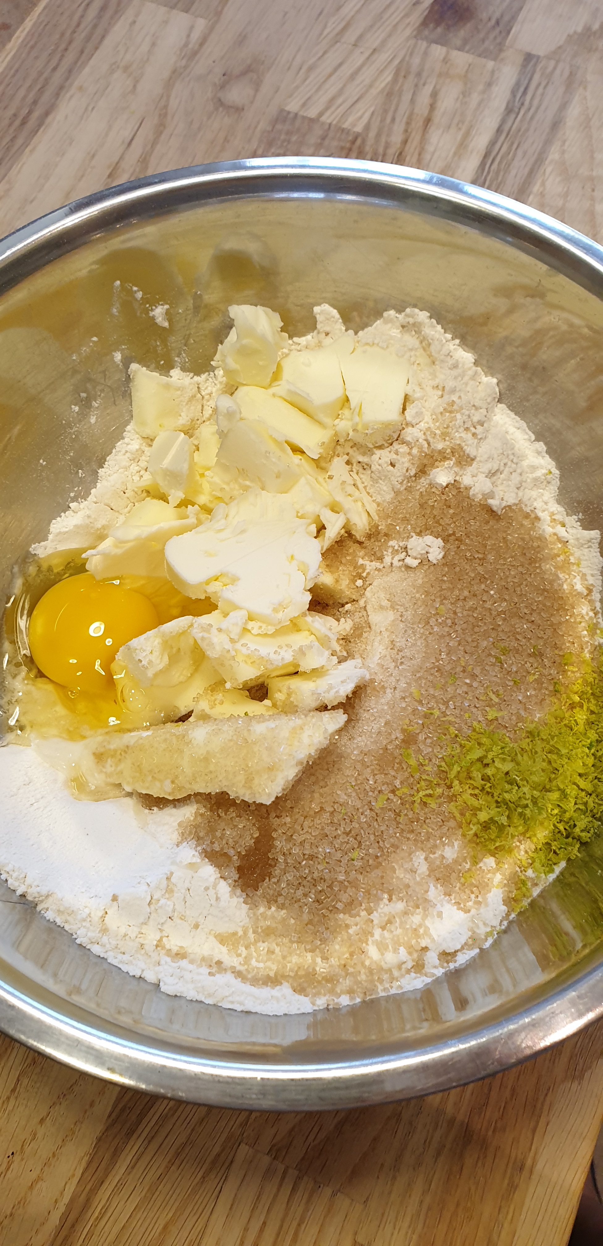 - Tani në një enë të thellë ovale i qitni të gjithë përbërësit: miellin, pluhurin për gatim, sheqerin, vezën dhe puterin/gjalpin e coptuar