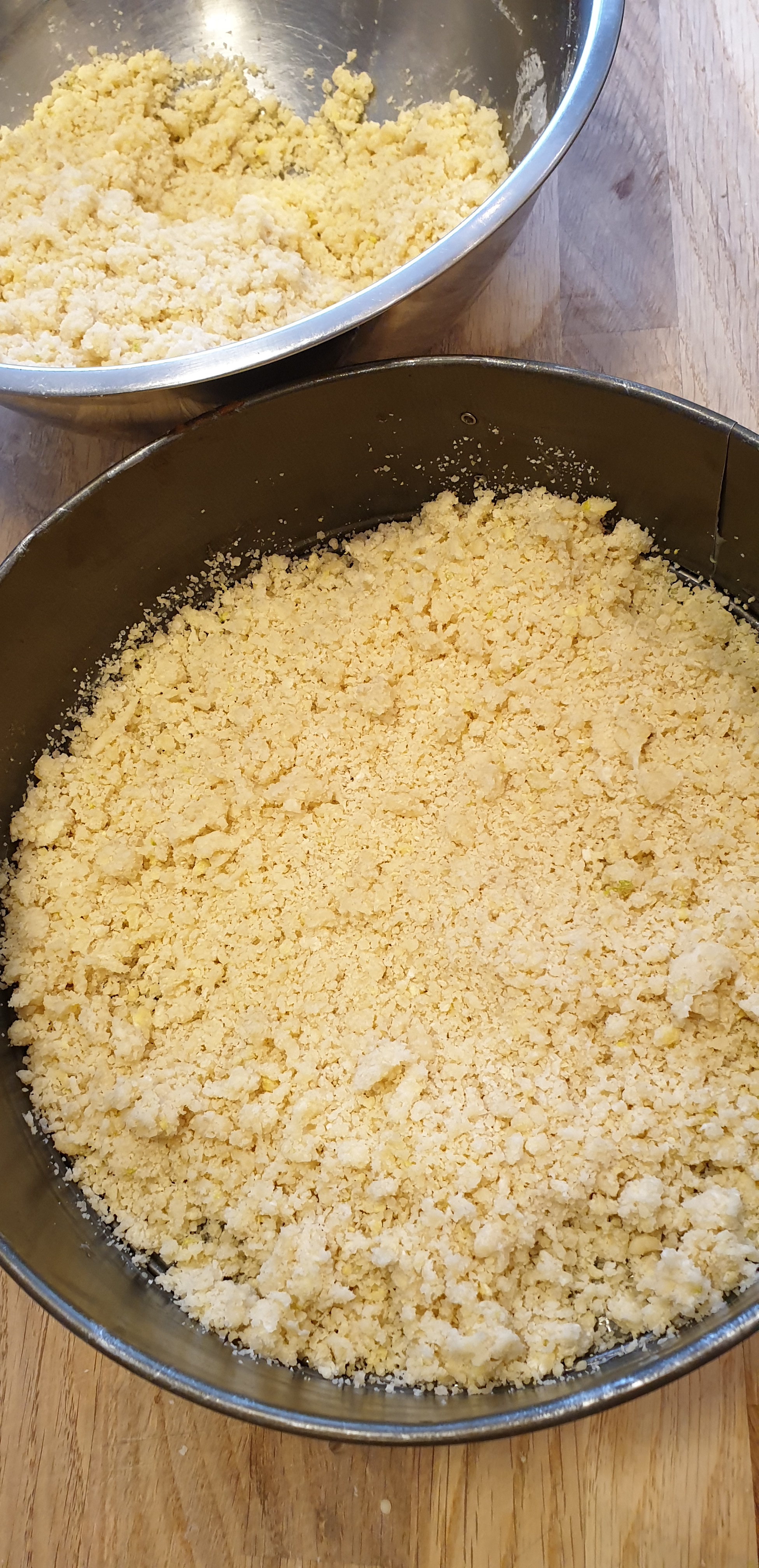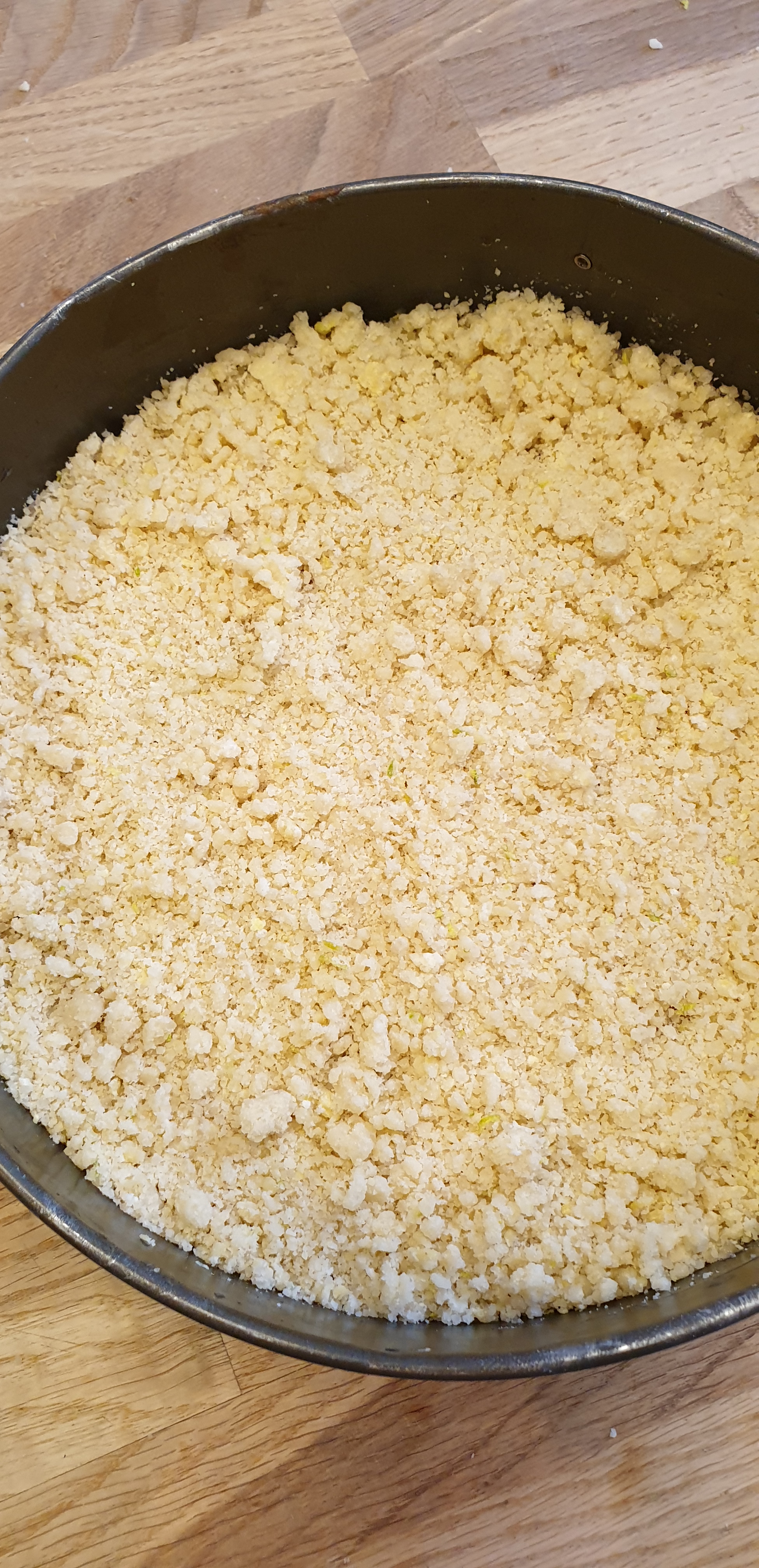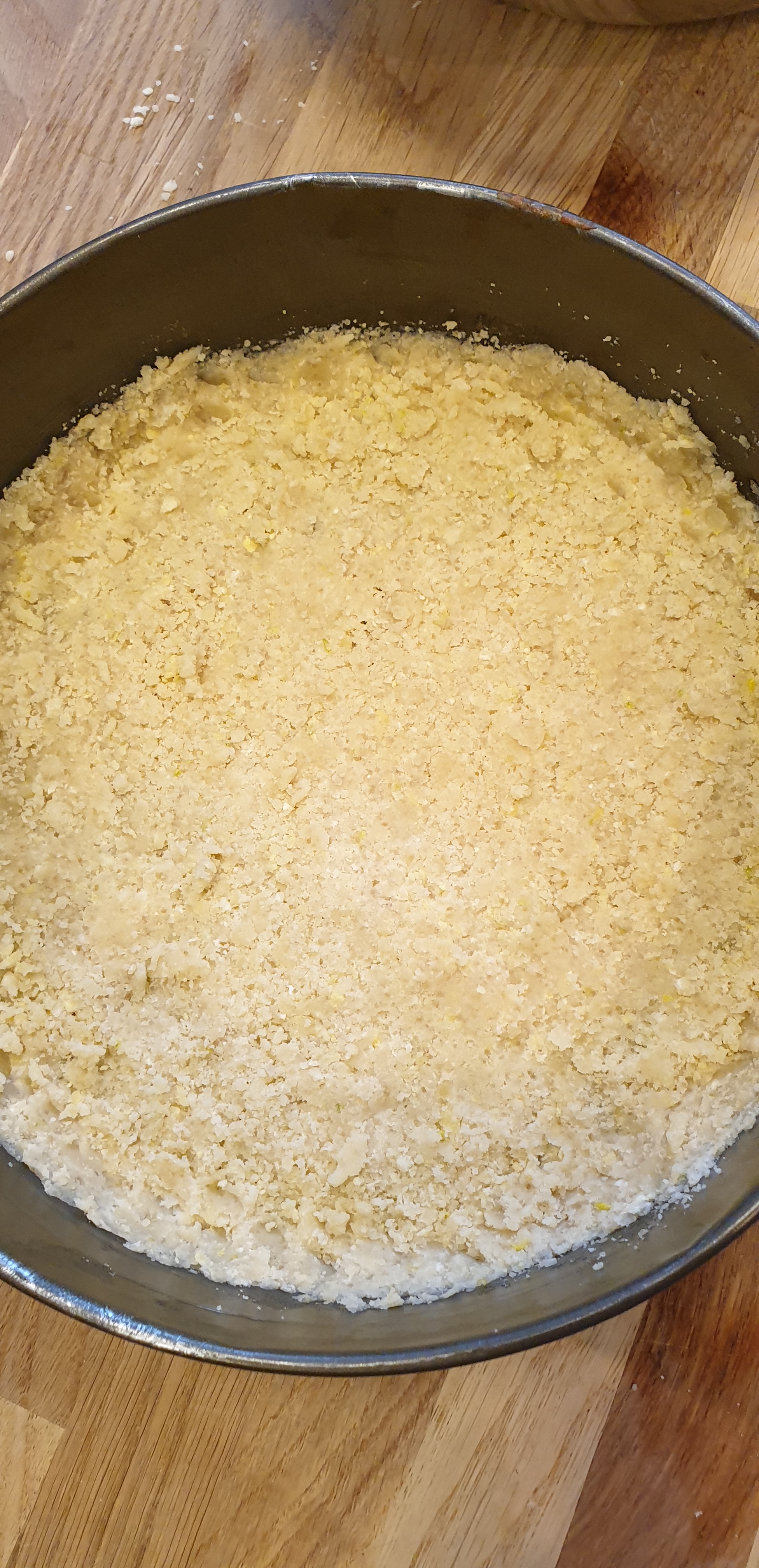 - Tani e bëni gati një tepsi me diametër 22-24 cm që i largohet rrethi. E lyeni me puter/gjalpë në fund dhe anash. E lëshoni furrën në temperaturë 180°C