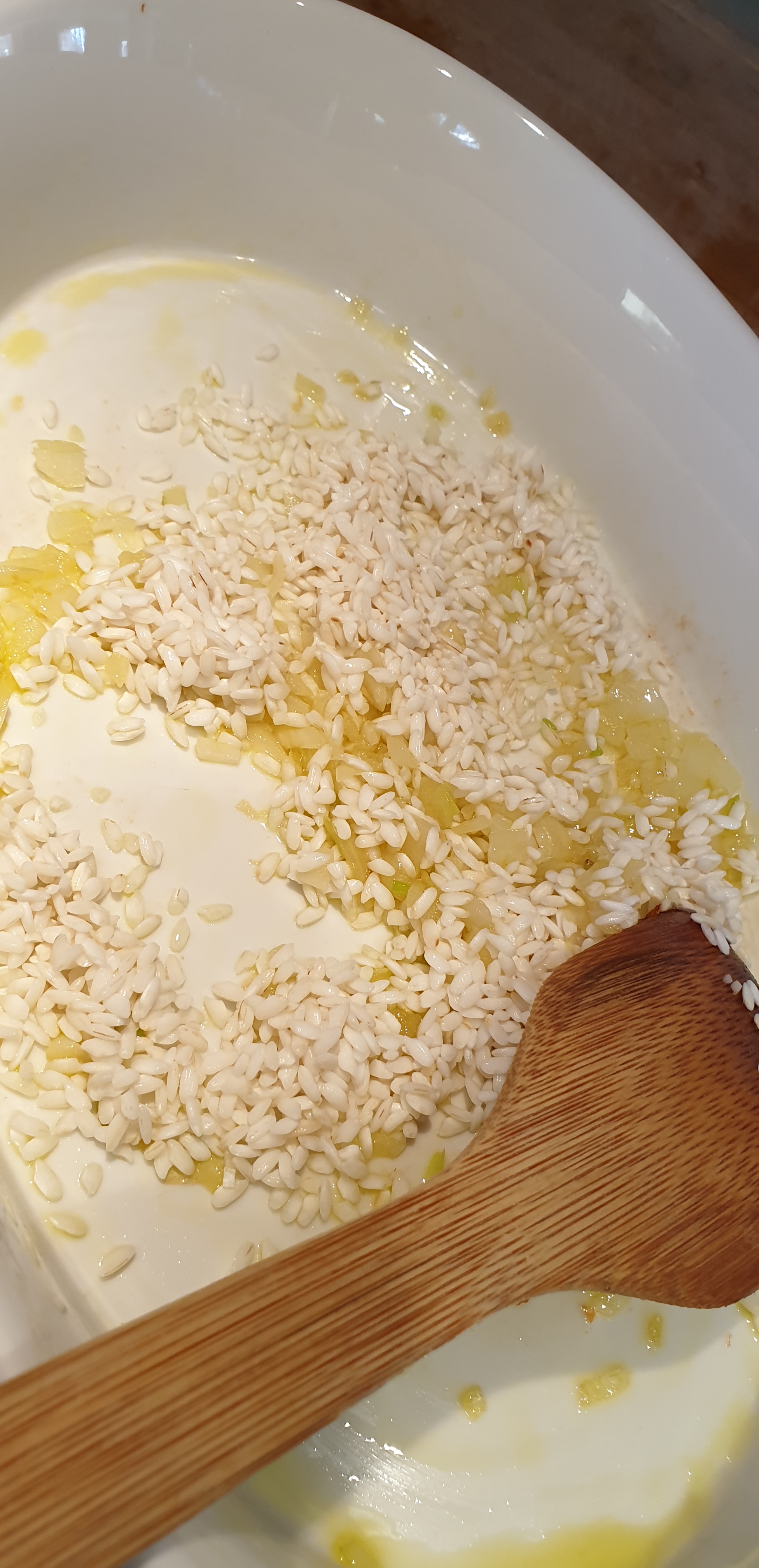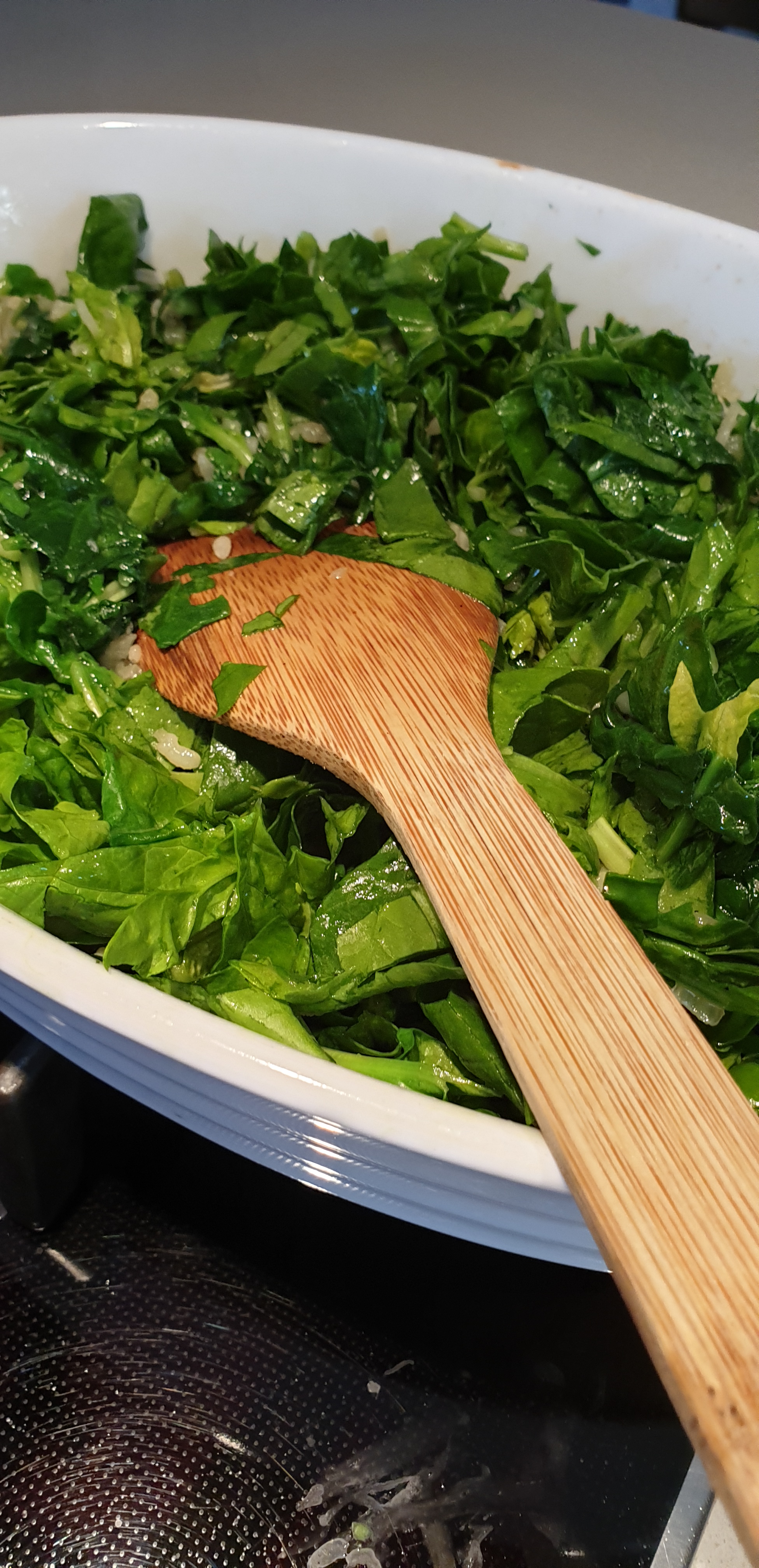 - E leni që të zihet orizi në temperaturë mesatarisht të lartë dhe në momentin që vëreni që është gati të zbutet ia shtoni spinaqin dhe me kujdes e rrotulloni që të zbutet. Posa të zbutet i shtoni piperin e zi mbi spinaq dhe ia qitni edhe copën e mishit
