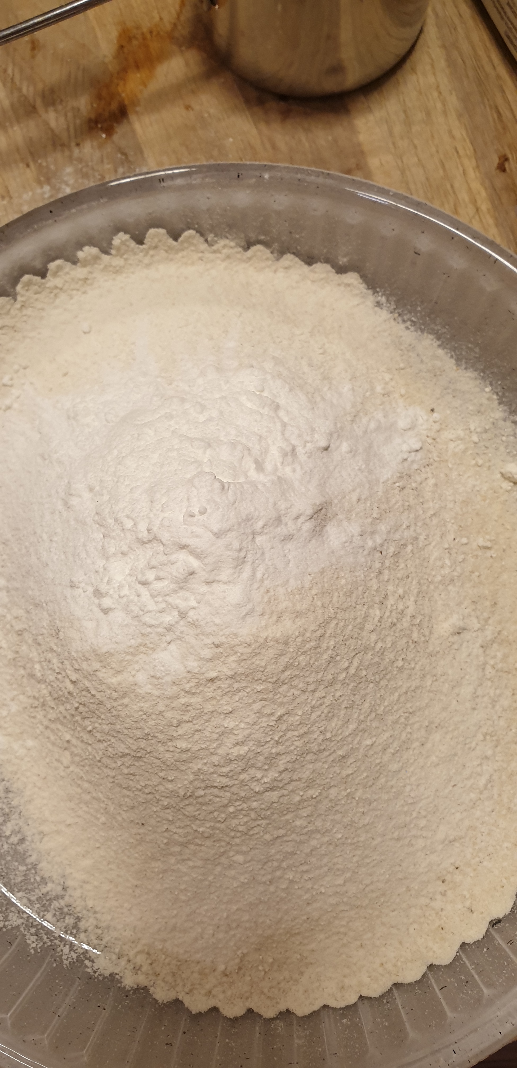 - Në një enë i përzieni miellin e grurit me miellin e misrit dhe pluhurin për fryerje