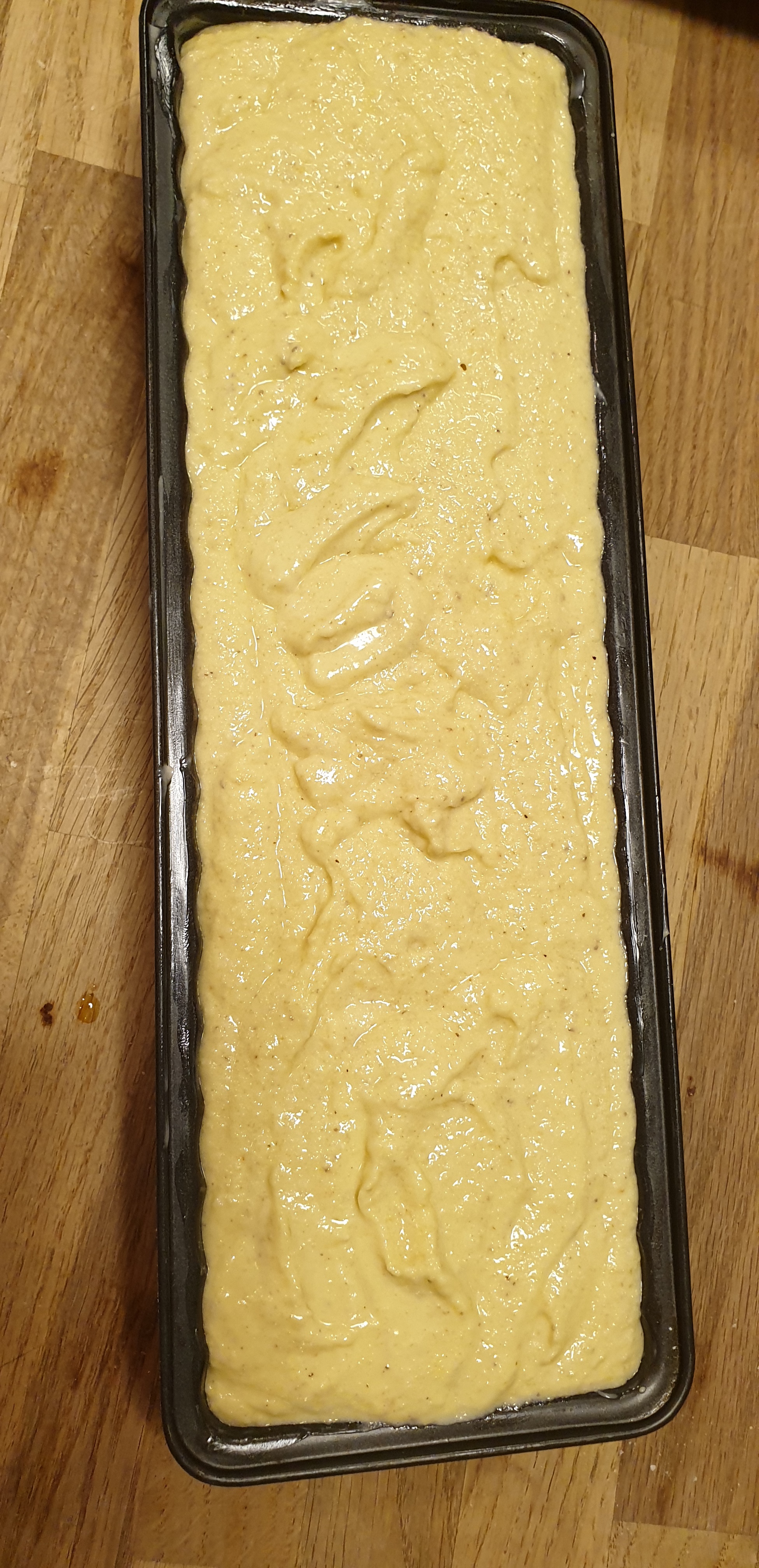 - I përzieni mirë deri sa të bashkëdyzohet mirë dhe e zbrazni masën në enën e pregatitur dhe e rrafshoni pak