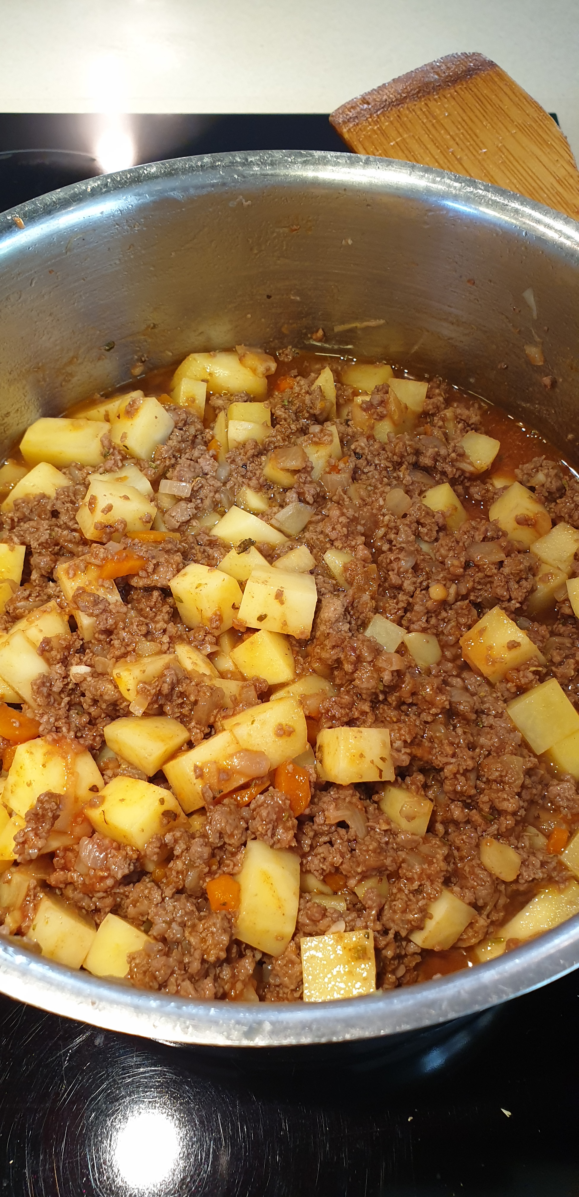 Kjo recetë e lehtë dhe që zihet në një enë, është praktike dhe e shpejtë kur nuk keni shumë kohë që të merreni me drekën. Është recetë që pëlqehet shumë sidomos nga fëmijët. Unë kam kohë të gjatë që nuk e kam pregatitë pasi që kam pasë vështirësi të gjej patate organike. Tani nuk e kam më këtë problem pasi që e kam më lehtë të gjej patate organike prandaj edhe mu kujtua që ta pregatis.