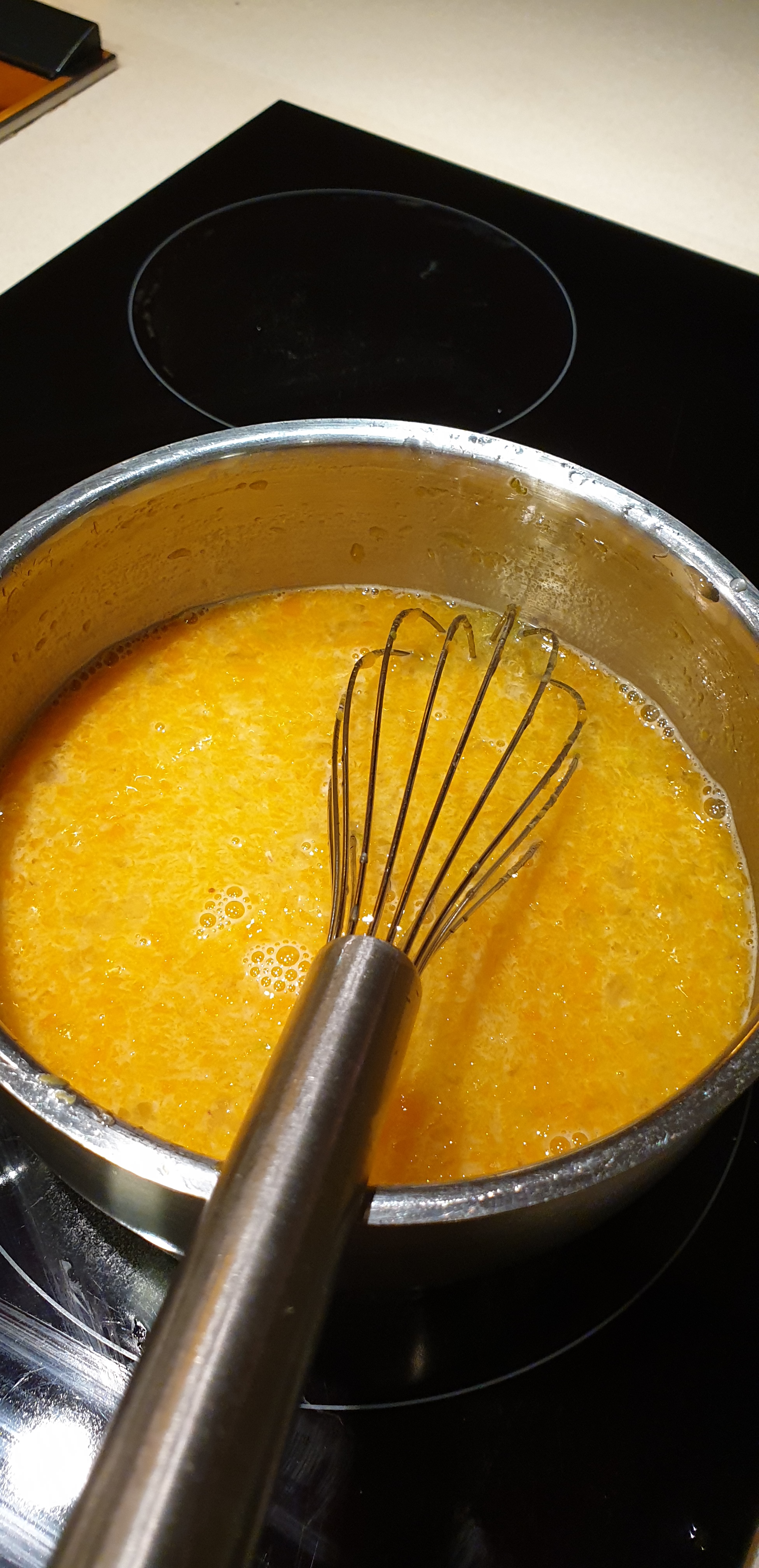 - E përzieni deri sa të vëreni që ka filluar të trashet por kurrsesi nuk guxon të vlojë. E vëreni që është mjaftë kur e mbani pak lugën jashtë kremit dhe e vëreni që kremi e mbështjellë lugën (si në foto). E mbyllni zjarrin tërësisht dhe e leni edhe pak duke e përzier