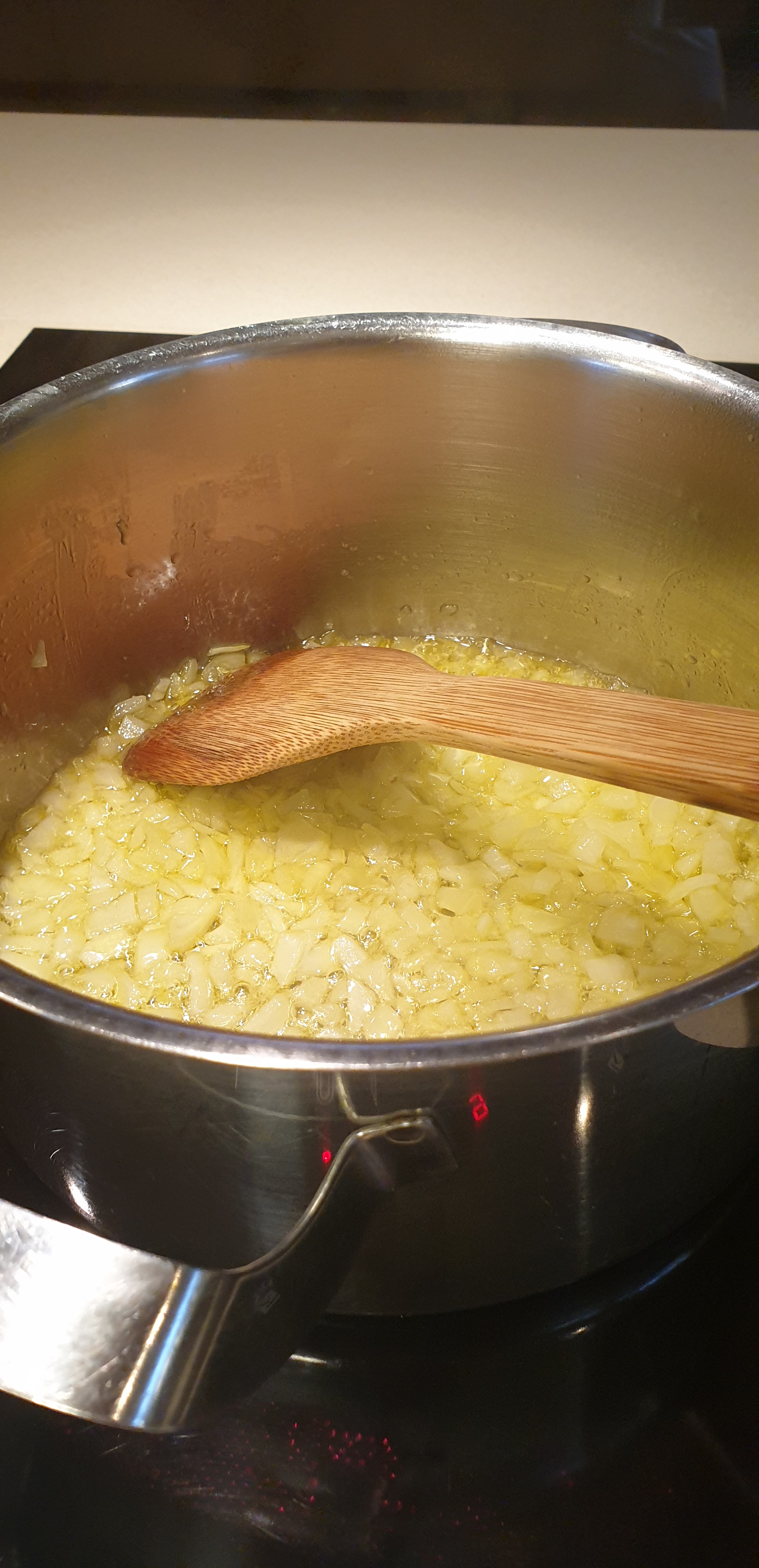 - Në një tenxhere të thellë, por të gjërë, e shtoni vajin dhe qepët dhe i fërgoni në zjarrë të lartë për 5 minuta. Ia shtoni hudrën e grimcuar (nëse nuk është e njomë) dhe e fërgoni afro 1 minutë