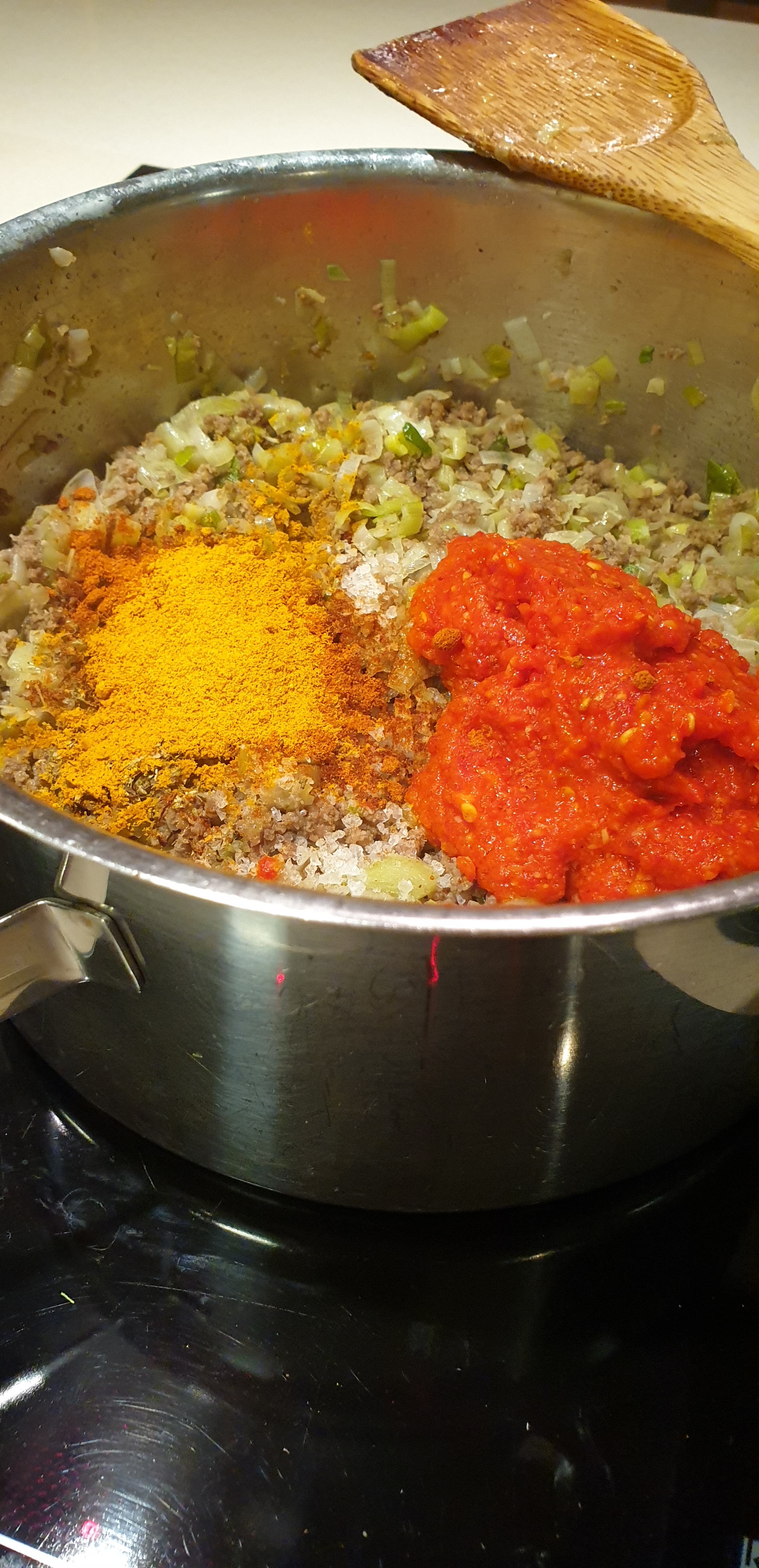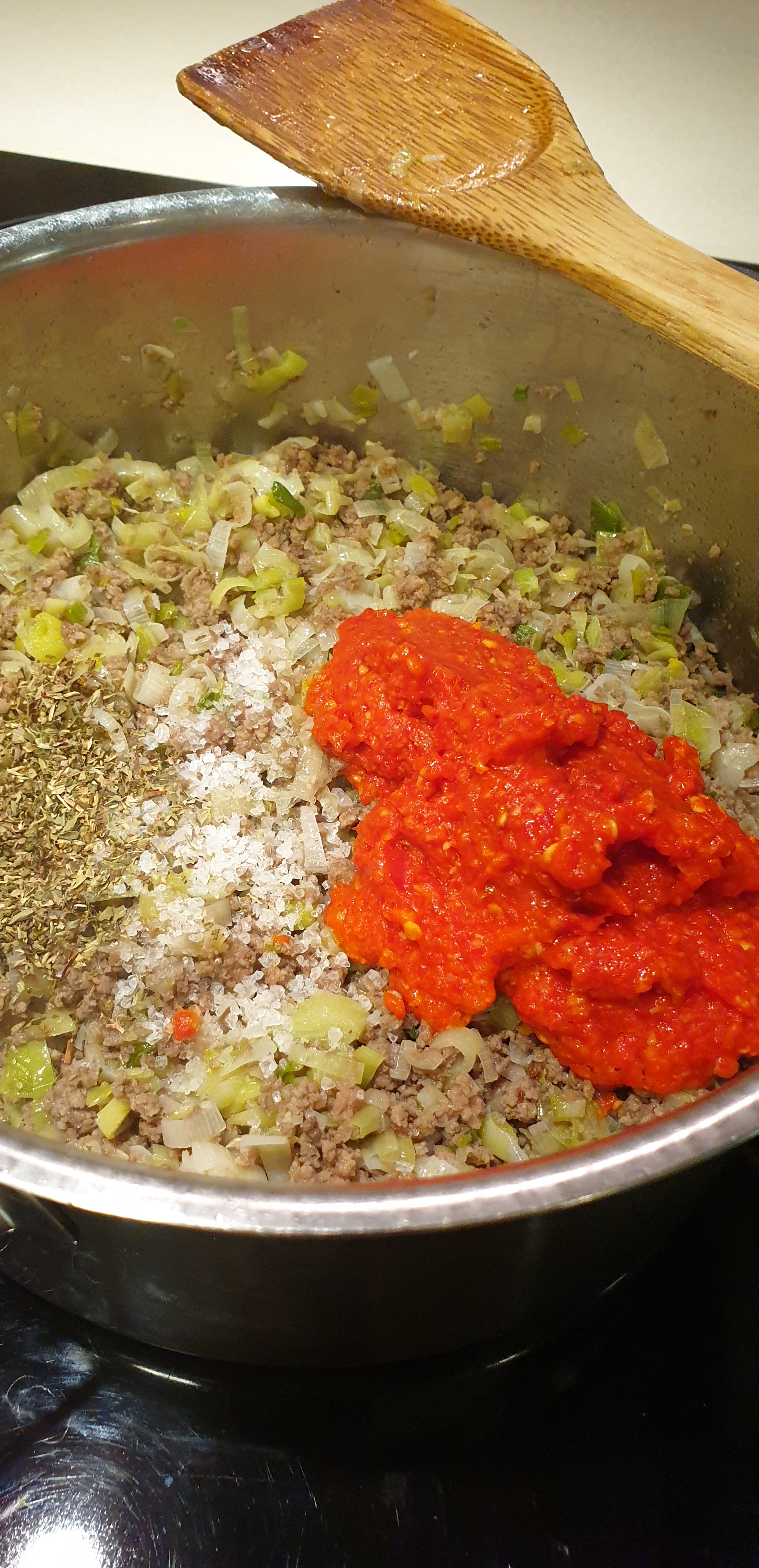 - Kur fillojnë të zbuten purritë/preshi i shtoni të gjitha mëlmesat dhe domaten dhe i përzieni mirë