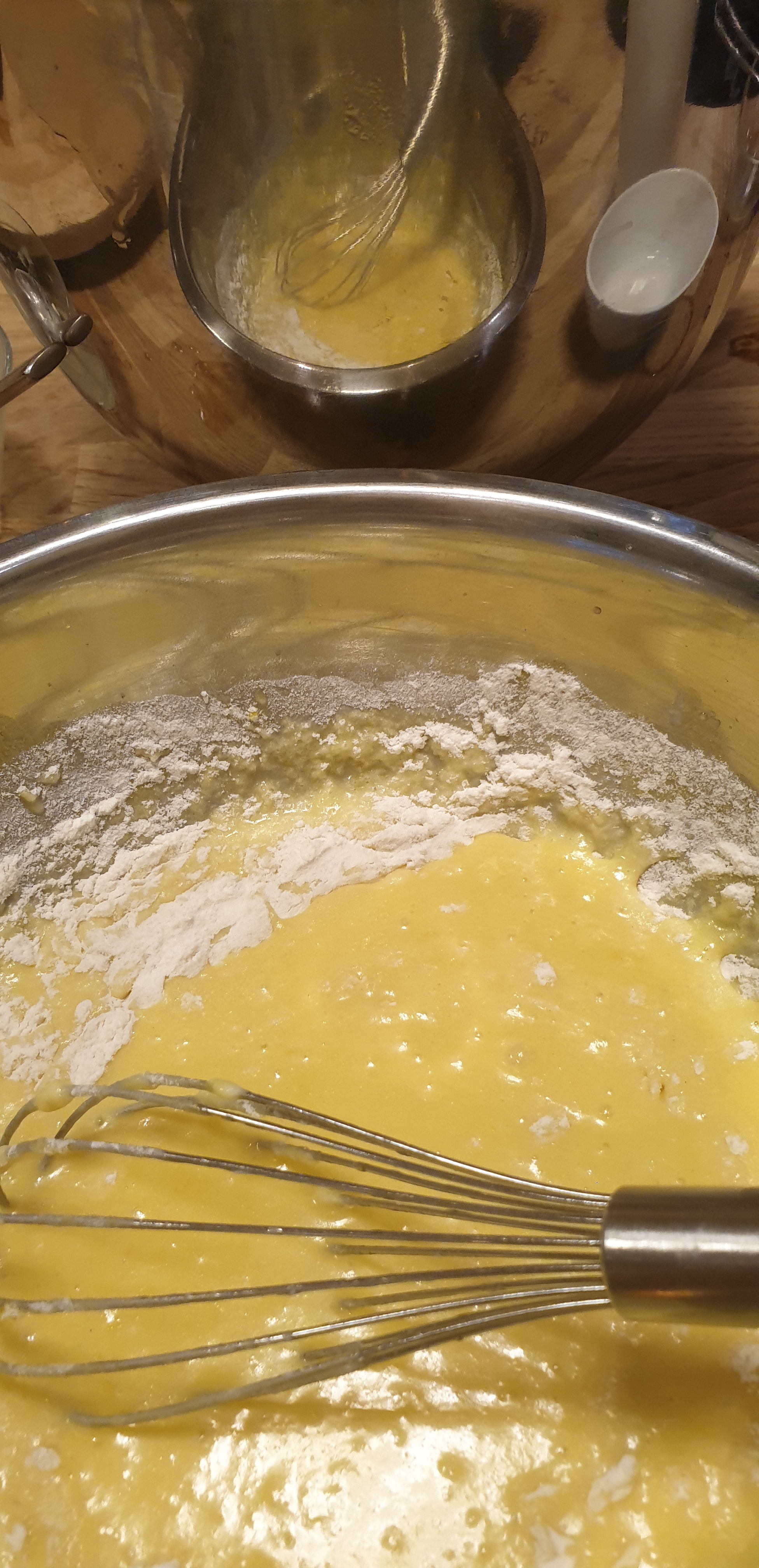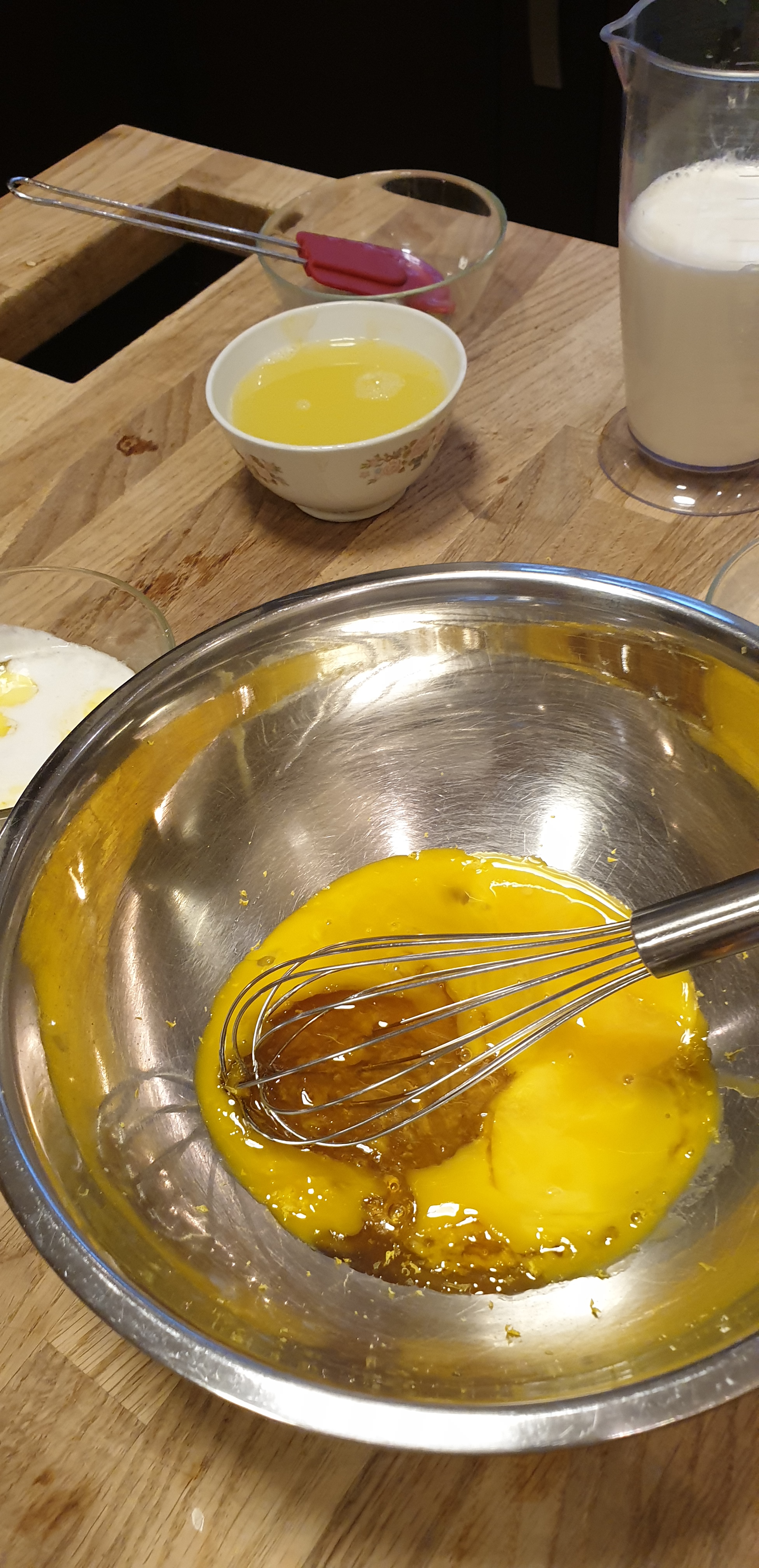 - Në një enë të thellë i përzieni mirë të kuqet e vezës me mjaltin (ose sheqerin). E shtoni puterin/gjalpin, apo vajin, duke e përzier. E shtoni lëngun e limonit duke e përzier dhe pastaj shtoni miellin