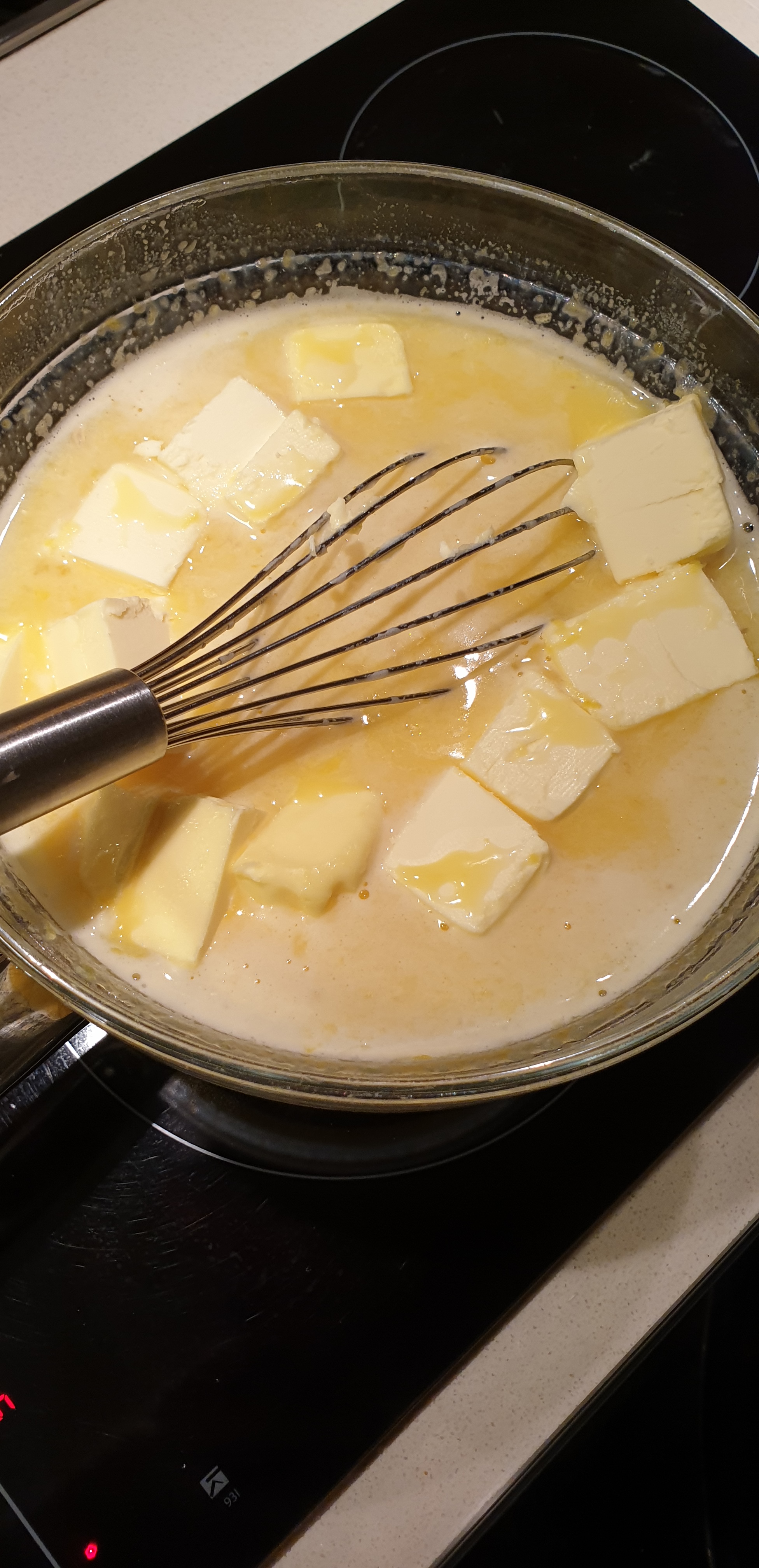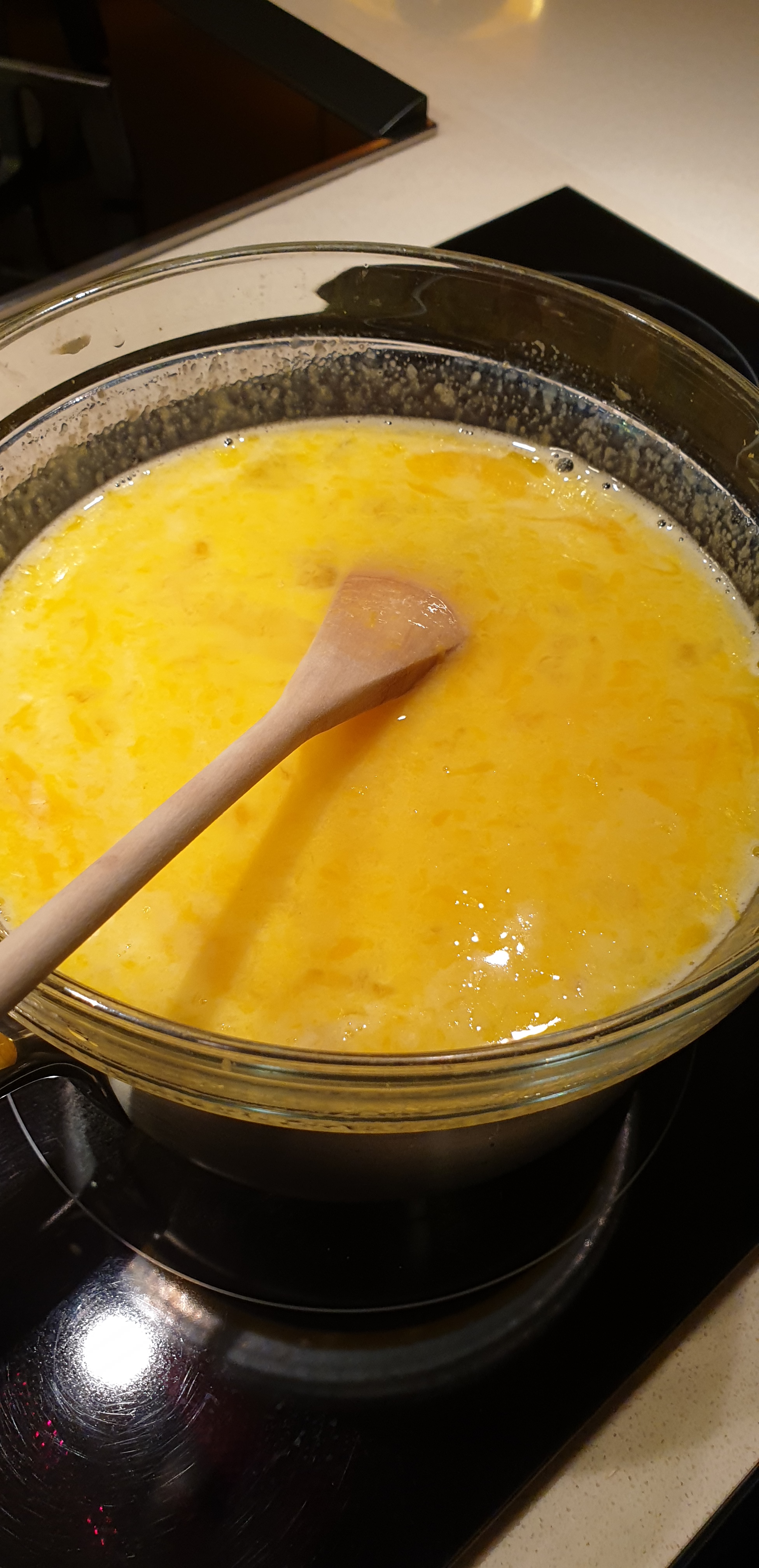 - Në një enë qelqi të thellë, i bëni së bashku lëvoren e limonit, vezët dhe lëngun e limonit së bashku me mjaltin apo sheqerin. I përzieni mirë dhe i qitni përmbi një ene të mbushur me ujë, por që të mos prekë fundi ujin (banja mari). E qitni në zjarrë të lartë dhe përzieni gradualisht deri sa të vëreni që masa ka filluar të ngrohet pak. Ia shtoni puterin/gjalipn e prerë në katrorë dhe vazdhoni ta përzieni deri sa që fillon të bëhet masë kremoze. Nëse uji vlon shumë, e ulni pak temperaturën. Në momentin që trashet kremi, pas 10 minutash afërsisht, e largoni nga zjarri dhe e leni të ftohet pak