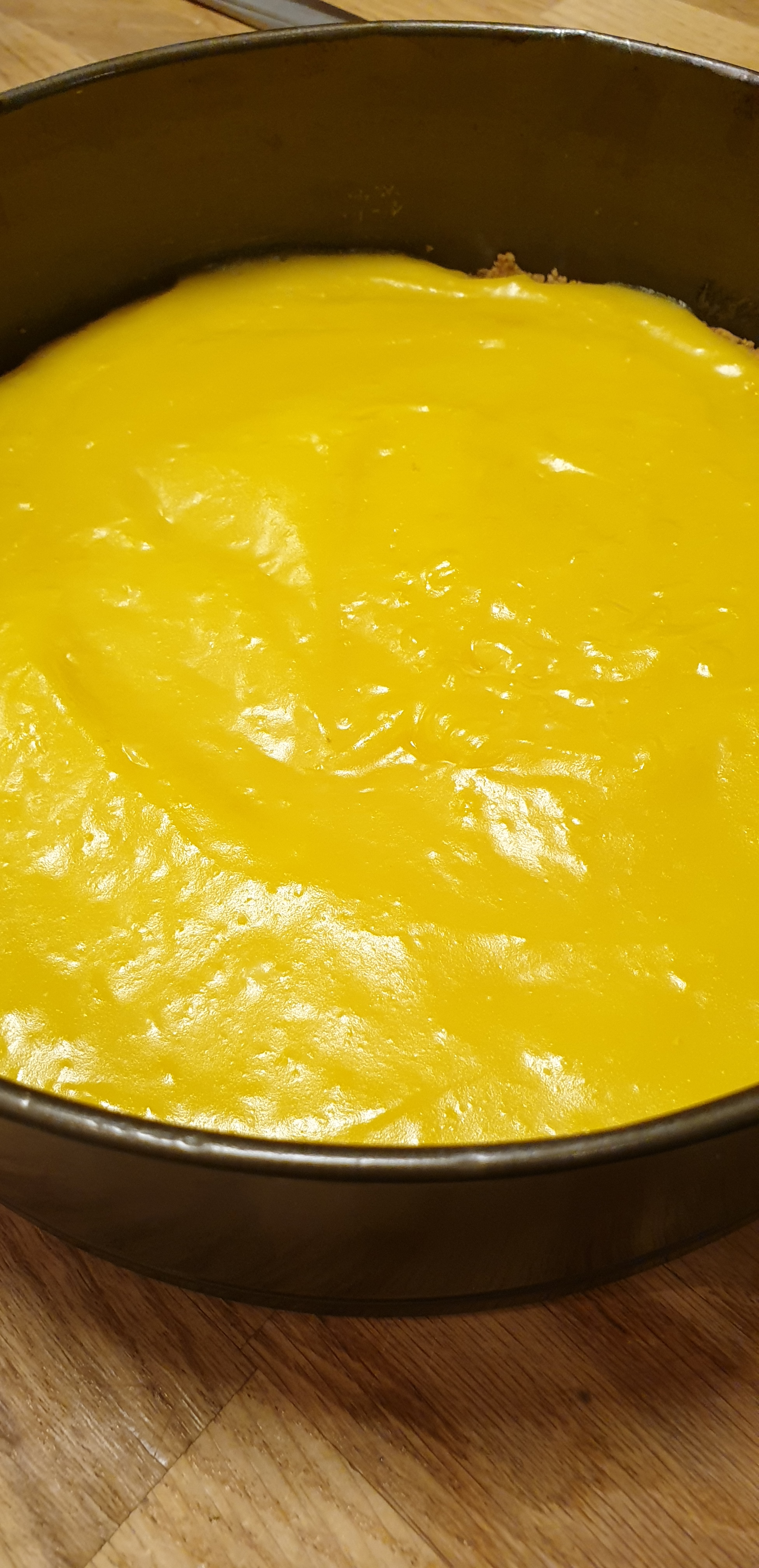 - Në momentin që ftohet pak kremi e shtoni mbi koren nga biskotat, me kujdes