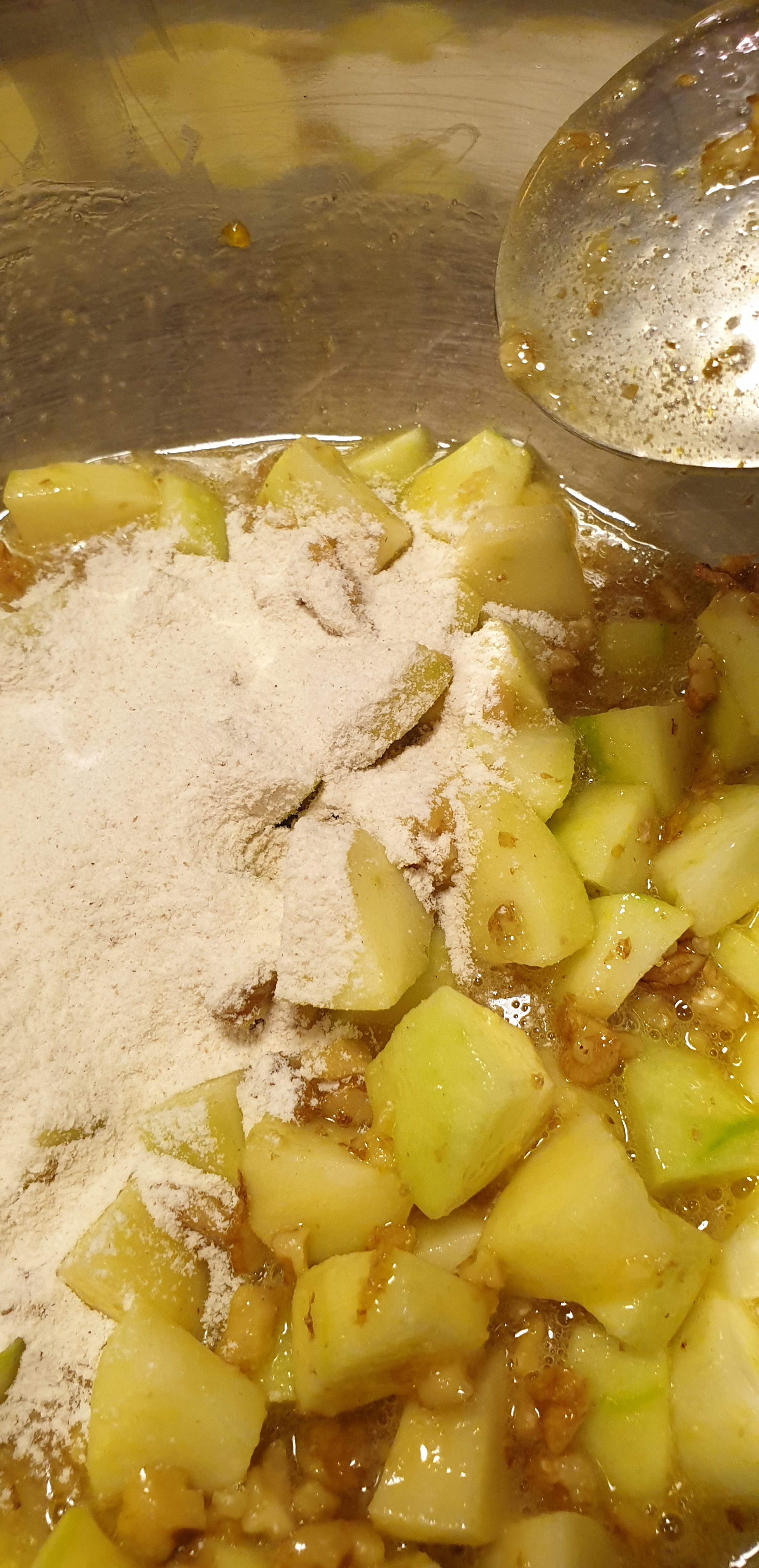 - I qëroni dhe i preni mollat në katrorë të vegjël të njëtrajtshëm. I coptoni arrat dhe i leni për më vonë