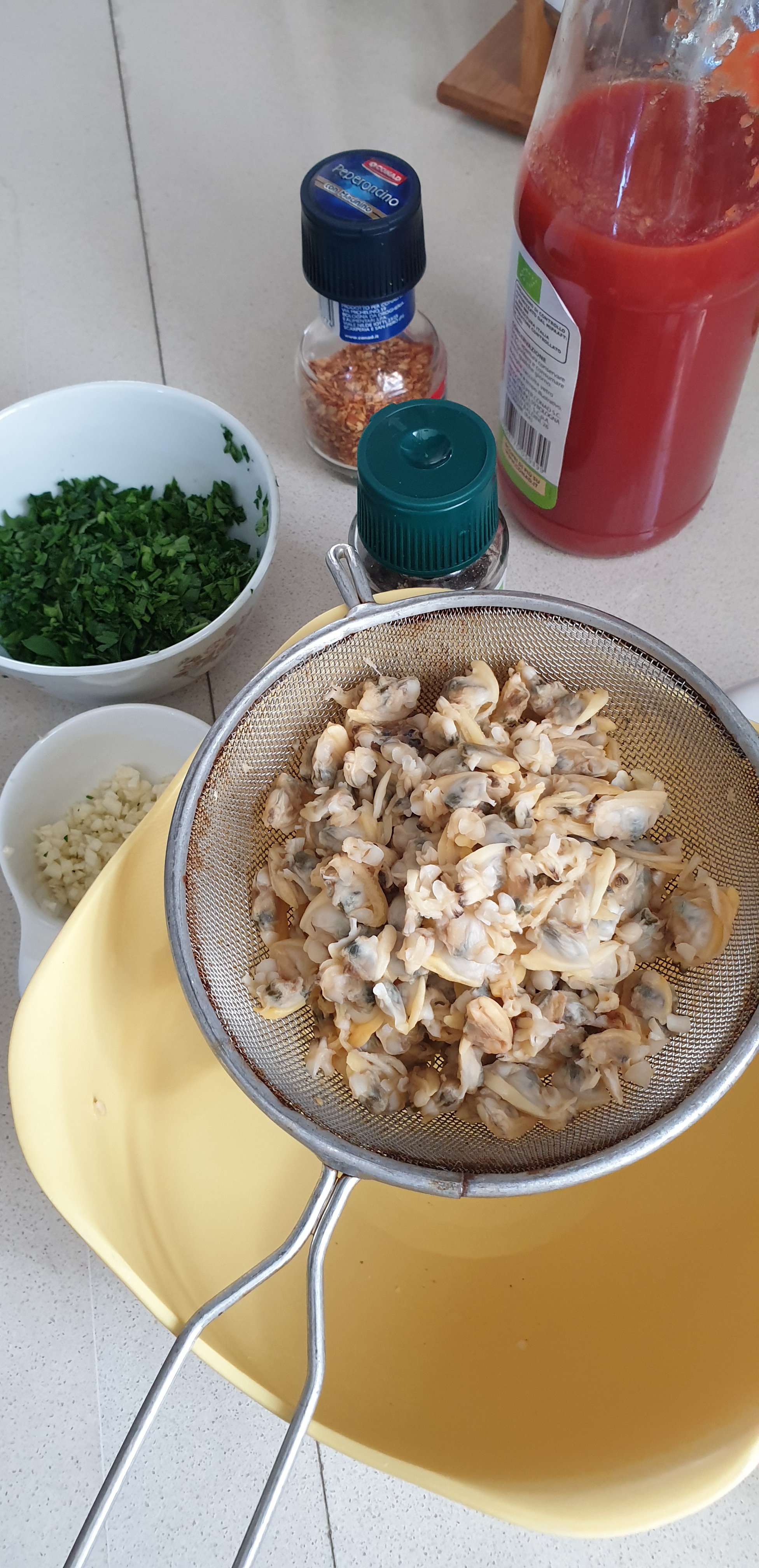 - I shpërlani mirë vongolet me ujë. I leni pak në ujë për çdo rast që ti largoni ndonjë mbetje të zallit/rërës. I kulloni mirë